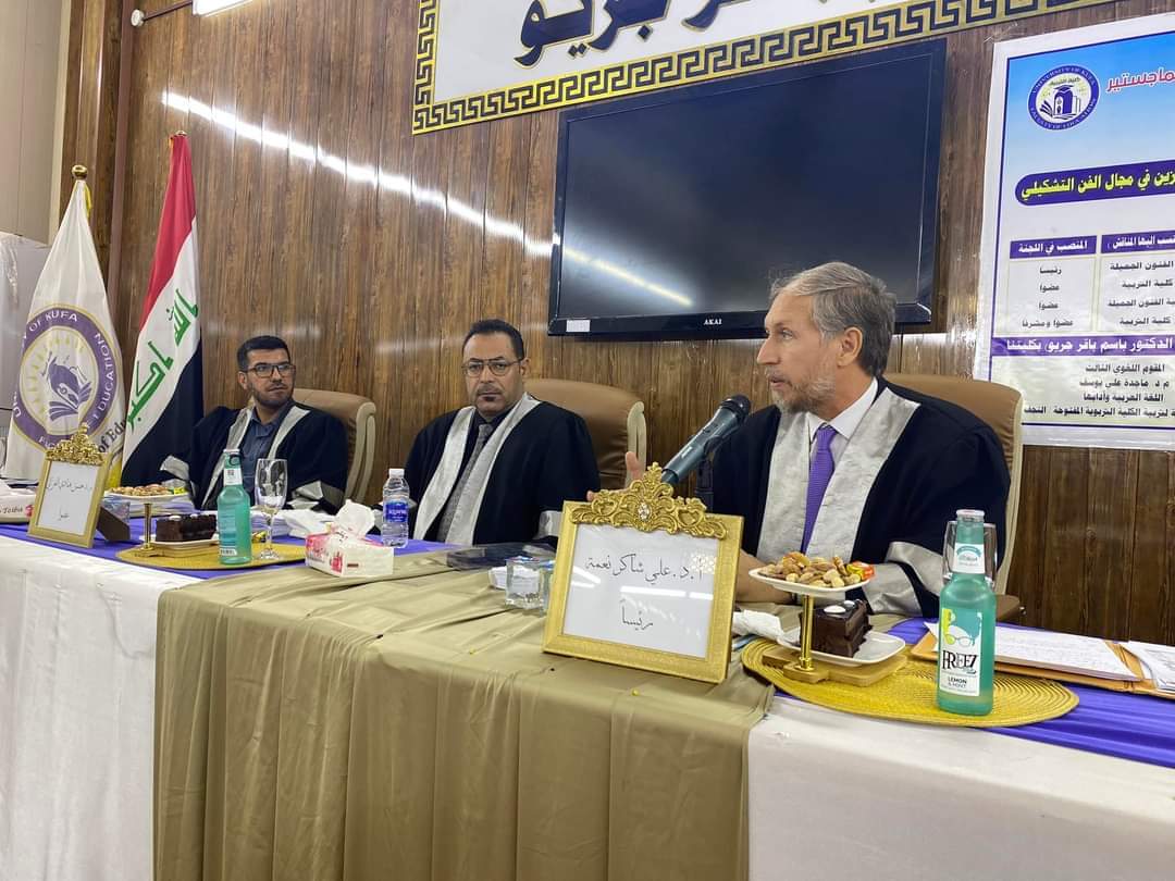 ترأس السيد عميد كلية الفنون الجميلة الاستاذ الدكتور كاظم نوير الزبيدي المحترم لجنة مناقشة رسالة الماجستير الموسومة ( الاعمال الفنية الناقدة وآثرها في تنمية مهارات طلبة قسم التربية الفنية في مادة الانشاء التصويري) في كلية التربية المختلطة جامعة الكوفة للباحثة فرح محمد عبد الباقي .