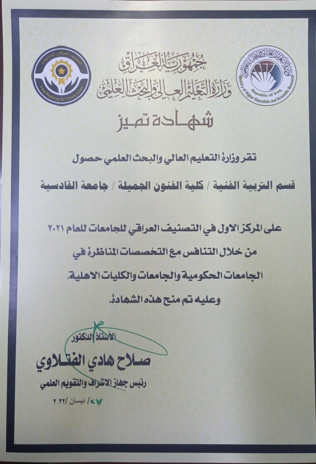 حصل قسم التربية الفنية في كلية الفنون الجميلة جامعة القادسية على شهادة التميز من وزارة التعليم العالي والبحث العلمي لحصوله على المركز الاول في التصنيف العراقي للجامعات لعام ٢٠٢١ من خلال التنافس مع التخصصات المناظرة في الجامعات الحكومية والجامعات والكليات الاهلية .