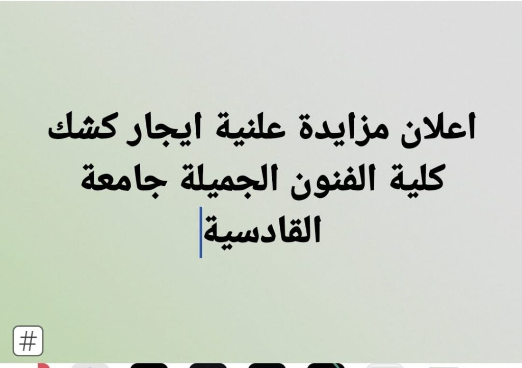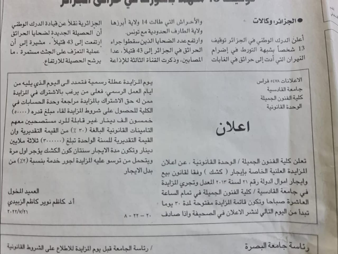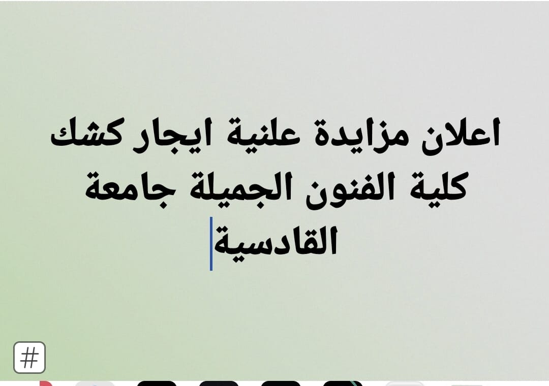 تعلن عمادة كلية الفنون الجميلة في جامعة القادسية / الوحده القانونية عن اعلان مزايده علنية الخاصة ياجار ( كشك ) وفقا لقانون بيع وايجار اموال الدولة رقم ٢١ لسنة ٢٠١٣ وتجري المزايده في جامعة القادسية كلية الفنون الجميلة في تمام الساعة العاشرة صباحا وتكون قائمة المزايده مفتوحة لمدة ٣٠ يوما تبدأ من اليوم التالي لنشر الاعلان في الصحيفة واذا صادف يوم المزايدة عطلة رسمية فتمدد الى اليوم الذي يليه من ايم العمل الرسمي فعلى الراغبين بالاشتراك في المزايدة ممن له حق الاشتراك بالمزايدة مراجعة وحدة الحسابات في الكلية للحصول على شروط المزايدة لقاء مبلغ قدرة (٥٠٠٠٠) خمسون الف دينار غير قابلة للرد مستصحبين معهم التامينات القانونية البالغة (٣٠%) من القيمة التقديرية وان القيمة التقديرية للسنة الواحدة تبلغ (٣٠٠٠٠٠٠) ثلاثة ملاين دينار وتكون مدة الايجار سنتان كون الكشك يؤجر اول مرة ويتحمل من ترسو عليه المزايدة اجور خدمة بنسبة (٢%) من بدل الايجار.