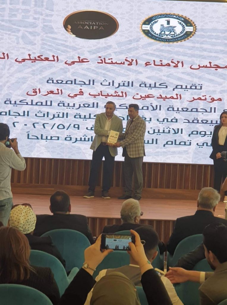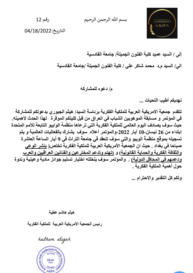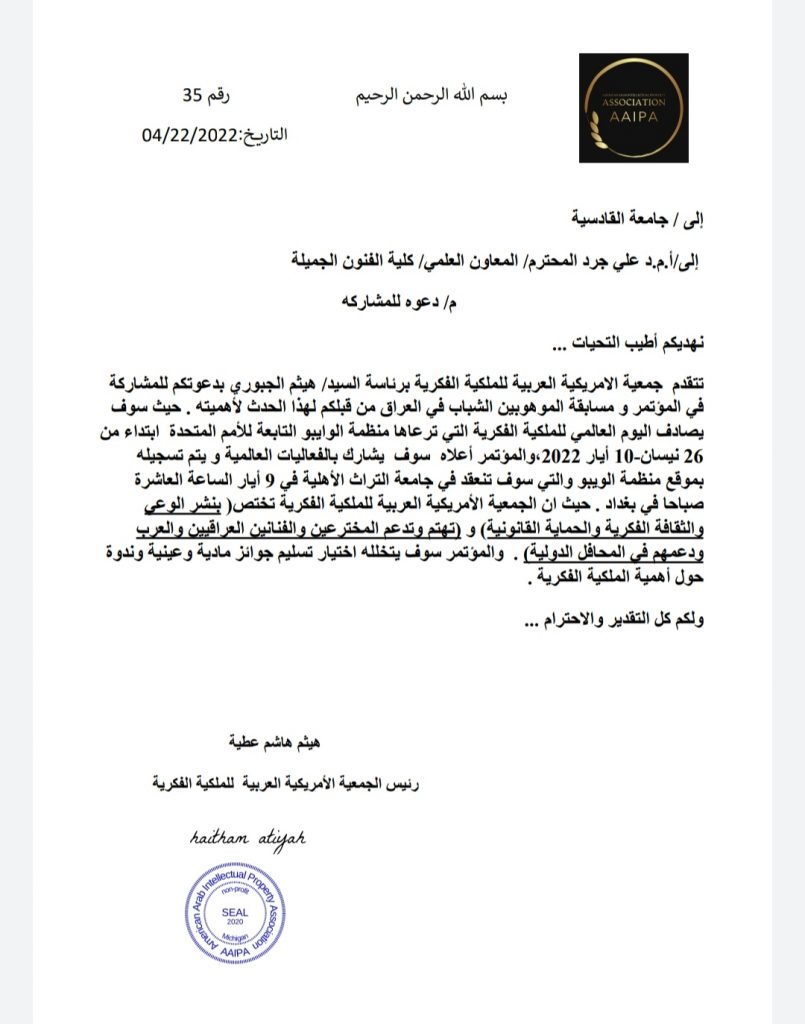 تلقى تدريسيون في كلية الفنون الجميلة جامعة القادسية متمثلتا بالسيد عميد كلية الفنون الجميلة الاستاذ الدكتور كاظم نوير الزبيدي المحترم والسيد معاون العميد للشؤون العلمية الدكتور علي جرد المحترم والتدريسي الدكتور محمد شاكر المحترم دعوة للمشاركة في اليوم العالمي للملكية الفكرية الذي تقيمه الجمعية الأمريكية العربية للملكة الفكرية برعاية منظمة الوايبو التابعة للأمم المتحدة ابتداءا من 26 نيسان – 10 ايار 2022 في جامعة التراث الأهلية في بغداد .