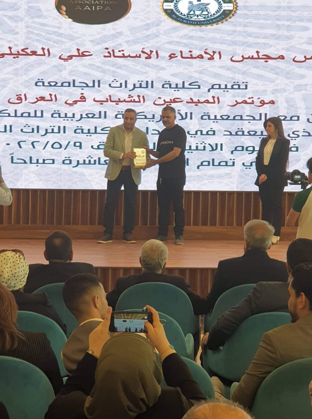 وكذلك تم تكريم الاساتذة المشاركين في المؤتمر وهم كل من الاستاذ المساعد الدكتور علي جرد معاون العميد للشؤون العلمية والاستاذ المساعد الدكتور احمد لفته رهمة القصير بدرع الابداع والتميز وشهادة تقديرية ايضا وتم اختيار الدكتور محمد شاكر عضوا محكما في عملية تقييم النتاجات العلمية والفنية .
