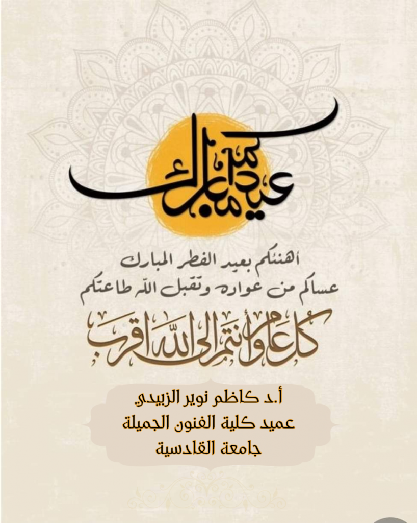 هنأ السيد عميد كلية الفنون الجميلة الاستاذ الدكتور كاظم نوير الزبيدي المحترم جميع منتسبي الكلية من تدريسيين وموظفين وطلبة بمناسبة حلول عيد الفطر المبارك مبتهلا إلى الله العلي القدير أن يحفظ العراق والعراقيين وأن يبارك في مسعى الخيرين من أجل خير البلاد والعباد.