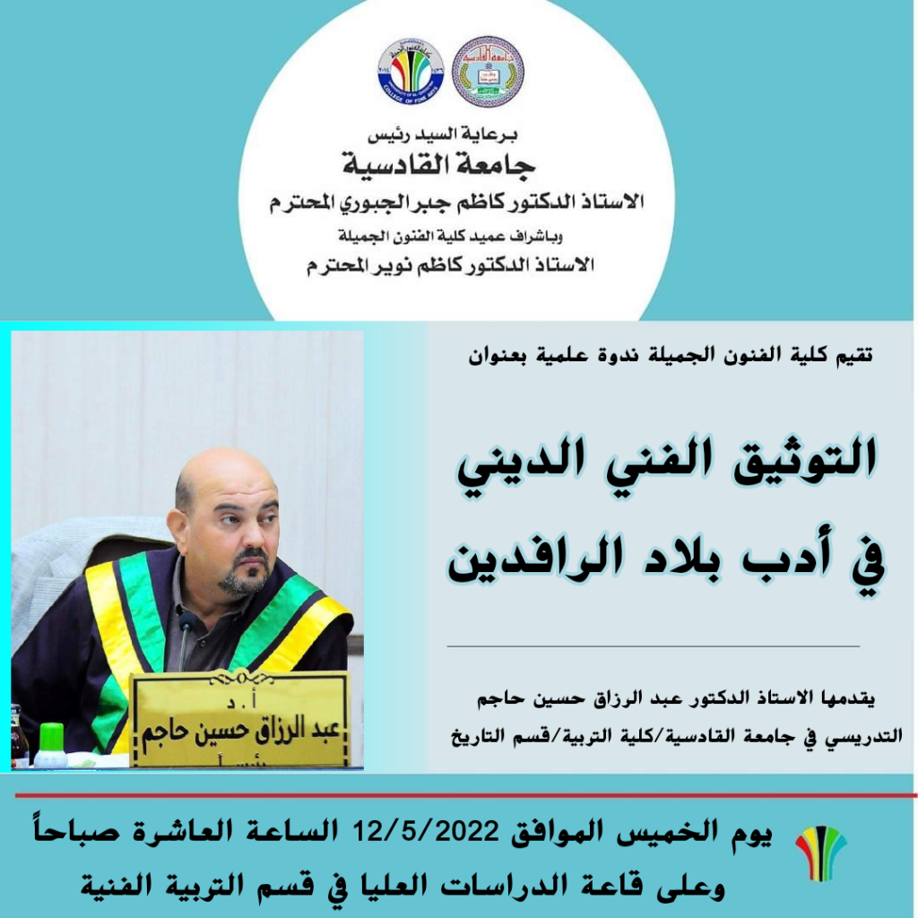 برعاية رئيس جامعة القادسية الاستاذ الدكتور كاظم جبر الجبوري المحترم واشراف السيد عميد كلية الفنون الجميلة الاستاذ الدكتور كاظم نوير الزبيدي المحترم تقيم كلية الفنون الجميلة جامعة القادسية ندوة علمية بعنوان ( التوثيق الفني الديني في أدب بلاد الرافدين ) والتي يقدمها الاستاذ الدكتور عبد الرزاق حسين حاجم التدريسي في جامعة القادسية /كلية التربية /قسم التاريخ .