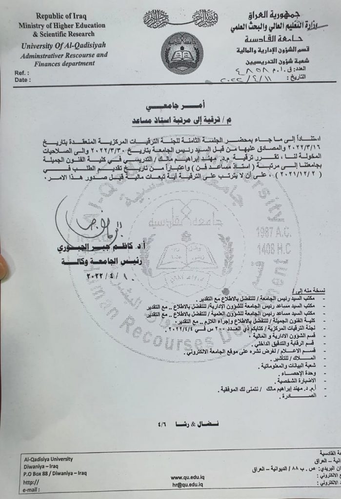 مثمنا جهوده العلمية المبذولة في سبيل حصوله على الترقية ألف مبارك والى مزيد من التقدم العلمي خدمة لكليتنا وجامعتنا العزيزة وعراقنا الحبيب