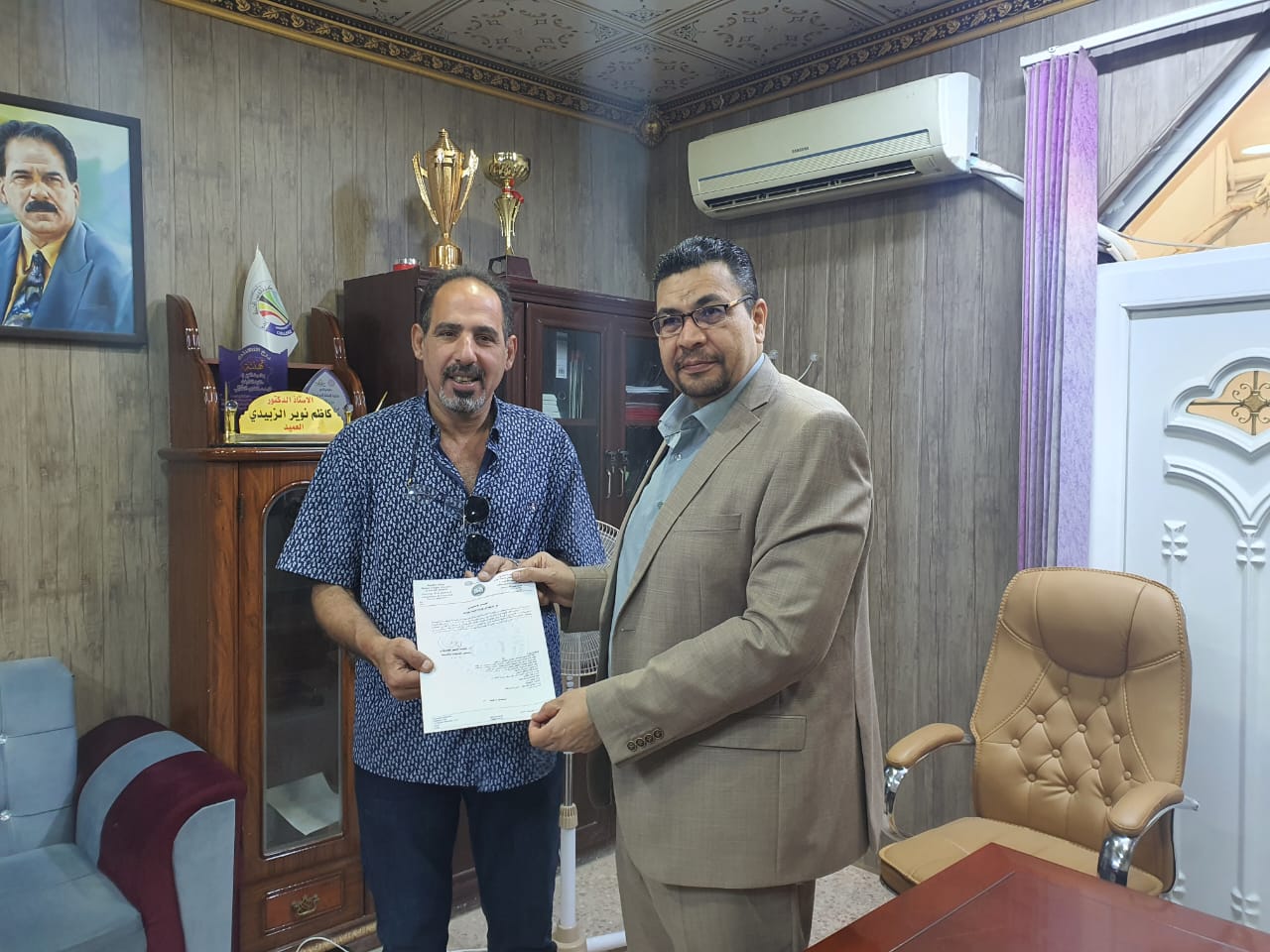 هنأ السيد عميد كلية الفنون الجميلة الاستاذ الدكتور كاظم نوير الزبيدي المحترم الأستاذ المساعد الدكتور مهند ابراهيم العميدي التدريسي في كلية الفنون الجميلة جامعة القادسية بمناسبة ترقيته إلى مرتبة استاذ مساعد فن .