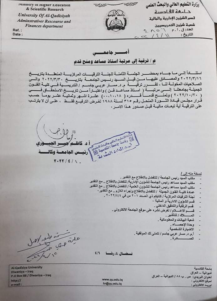 هنأ السيد عميد كلية الفنون الجميلة الاستاذ الدكتور كاظم نوير الزبيدي المحترم الأستاذ المساعد الدكتور مسار عربي جاسم التدريسية في كلية الفنون الجميلة جامعة القادسية بمناسبة ترقيتها إلى مرتبة استاذ مساعد فن .