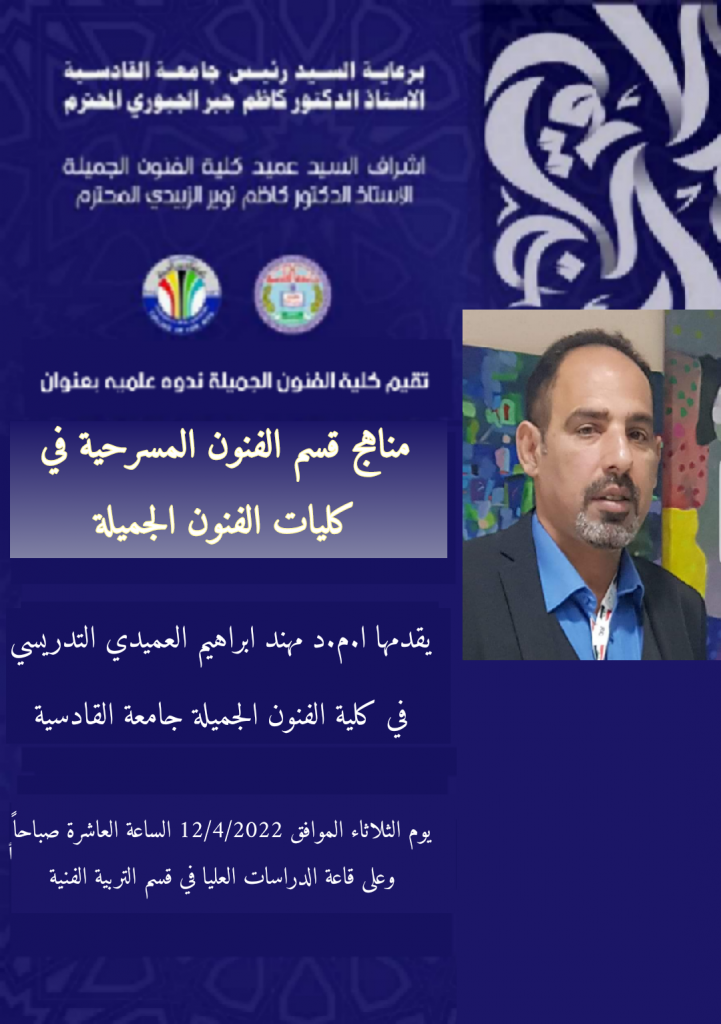 برعاية رئيس جامعة القادسية الاستاذ الدكتور كاظم جبر الجبوري المحترم واشراف السيد عميد كلية الفنون الجميلة الاستاذ الدكتور كاظم نوير الزبيدي المحترم تقيم كلية الفنون الجميلة جامعة القادسية ندوة علمية بعنوان ( مناهج قسم التربية الفنية الحديثة ) والتي يقدمها الاستاذ المساعد الدكتور عباس تركي محيسن التدريسي في كلية الفنون الجميلة جامعة القادسية .