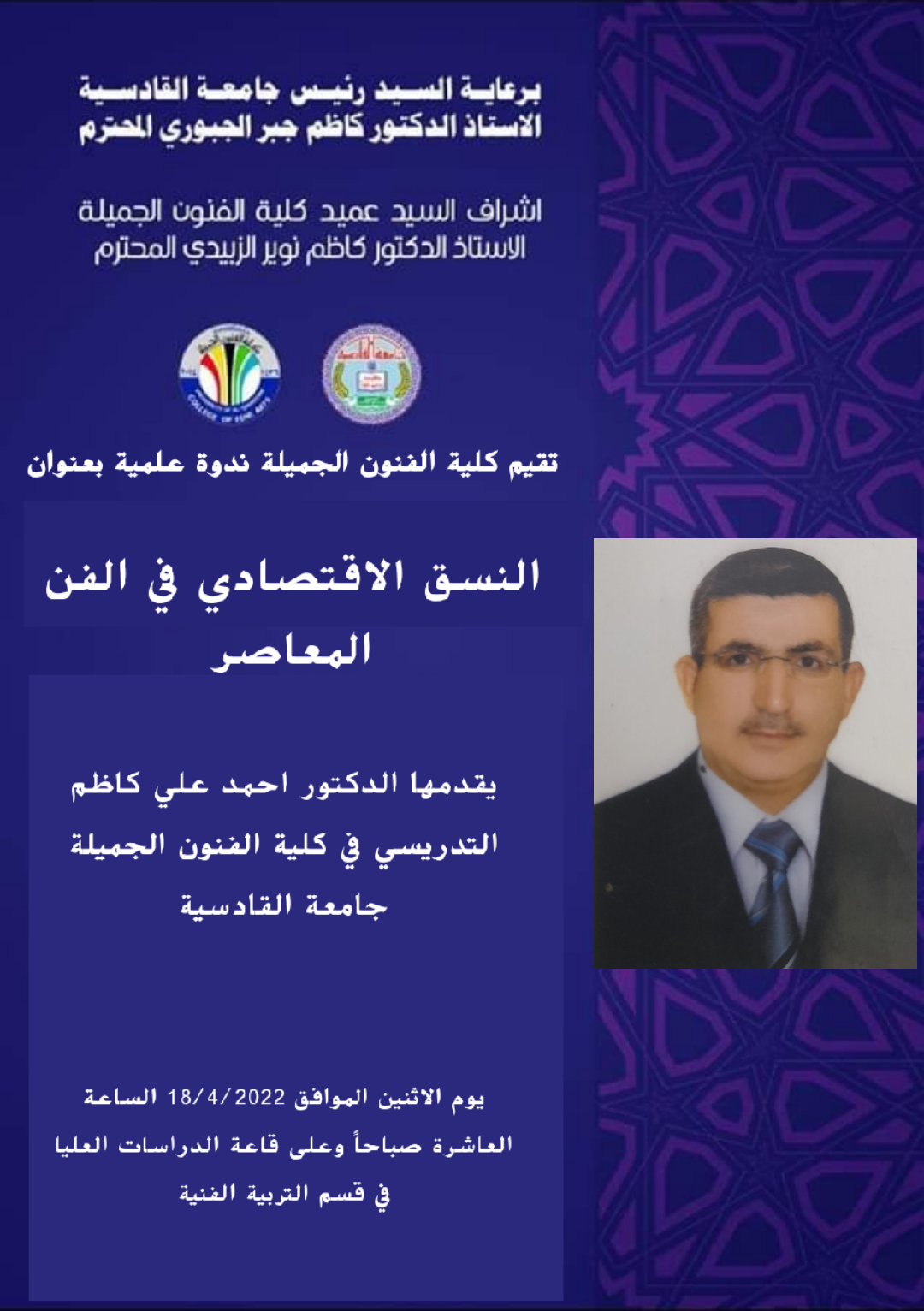 برعاية رئيس جامعة القادسية الاستاذ الدكتور كاظم جبر الجبوري المحترم واشراف السيد عميد كلية الفنون الجميلة الاستاذ الدكتور كاظم نوير الزبيدي المحترم تقيم كلية الفنون الجميلة جامعة القادسية ندوة علمية بعنوان ( النسق الاقتصادي في الفن المعاصر ) والتي يقدمها الدكتور احمد علي كاظم التدريسي في كلية الفنون الجميلة جامعة القادسية .