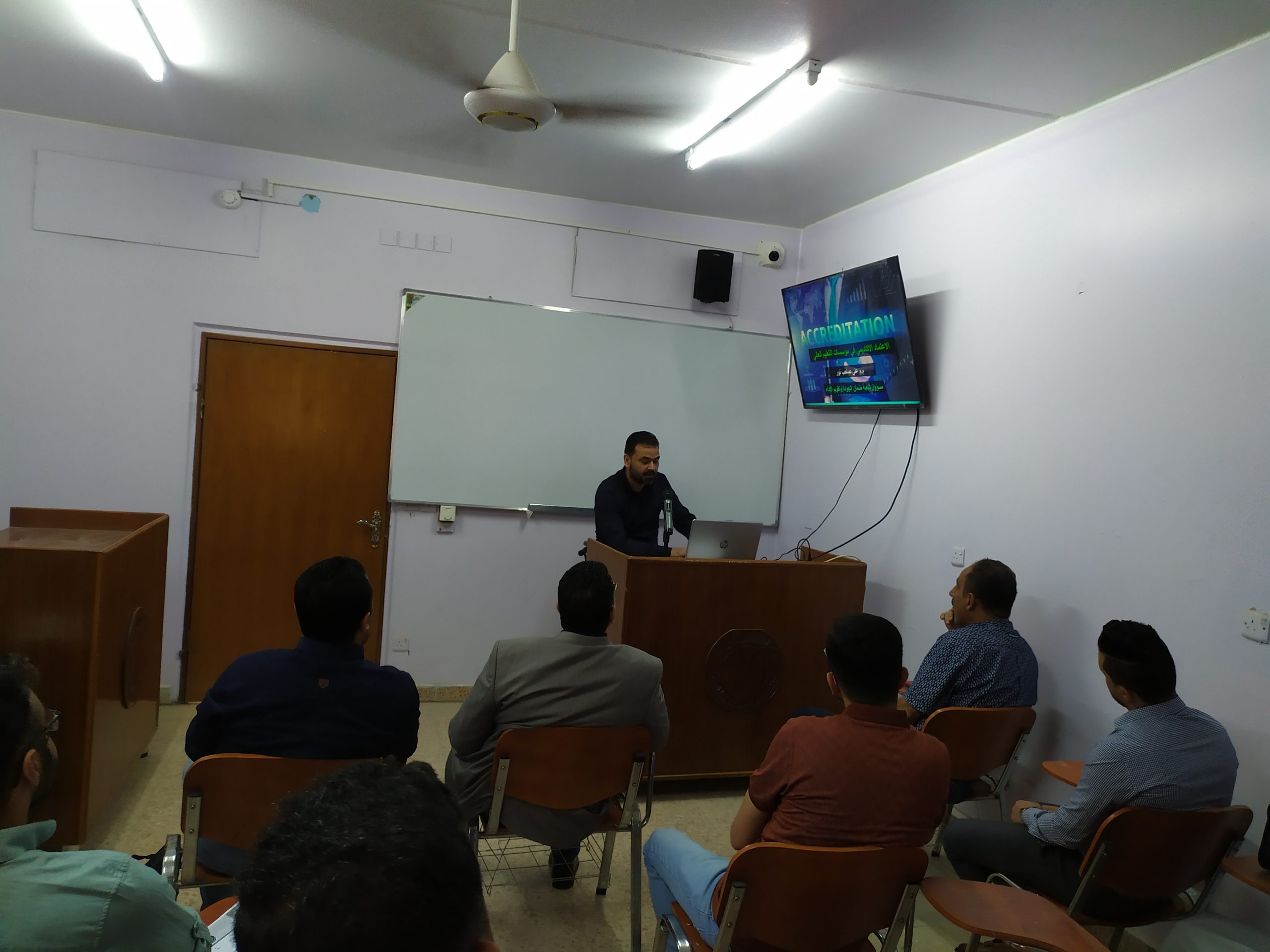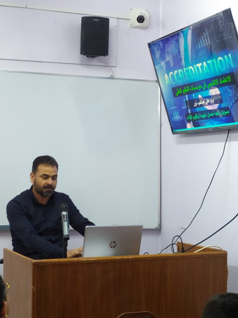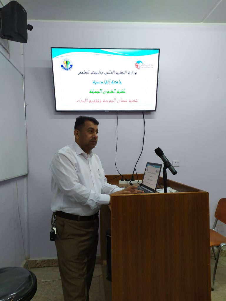 برعاية رئيس جامعة القادسية الاستاذ الدكتور كاظم جبر الجبوري المحترم واشراف السيد عميد كلية الفنون الجميلة الاستاذ الدكتور كاظم نوير الزبيدي المحترم قدمت كلية الفنون الجميلة جامعة القادسية ندوة علمية بعنوان ( الاعتماد الاكاديمي في وزارة التعليم العالي والبحث العلمي ) والتي قدمها المدرس المساعد علي صاحب نور التدريسي في كلية الفنون الجميلة جامعة القادسية .