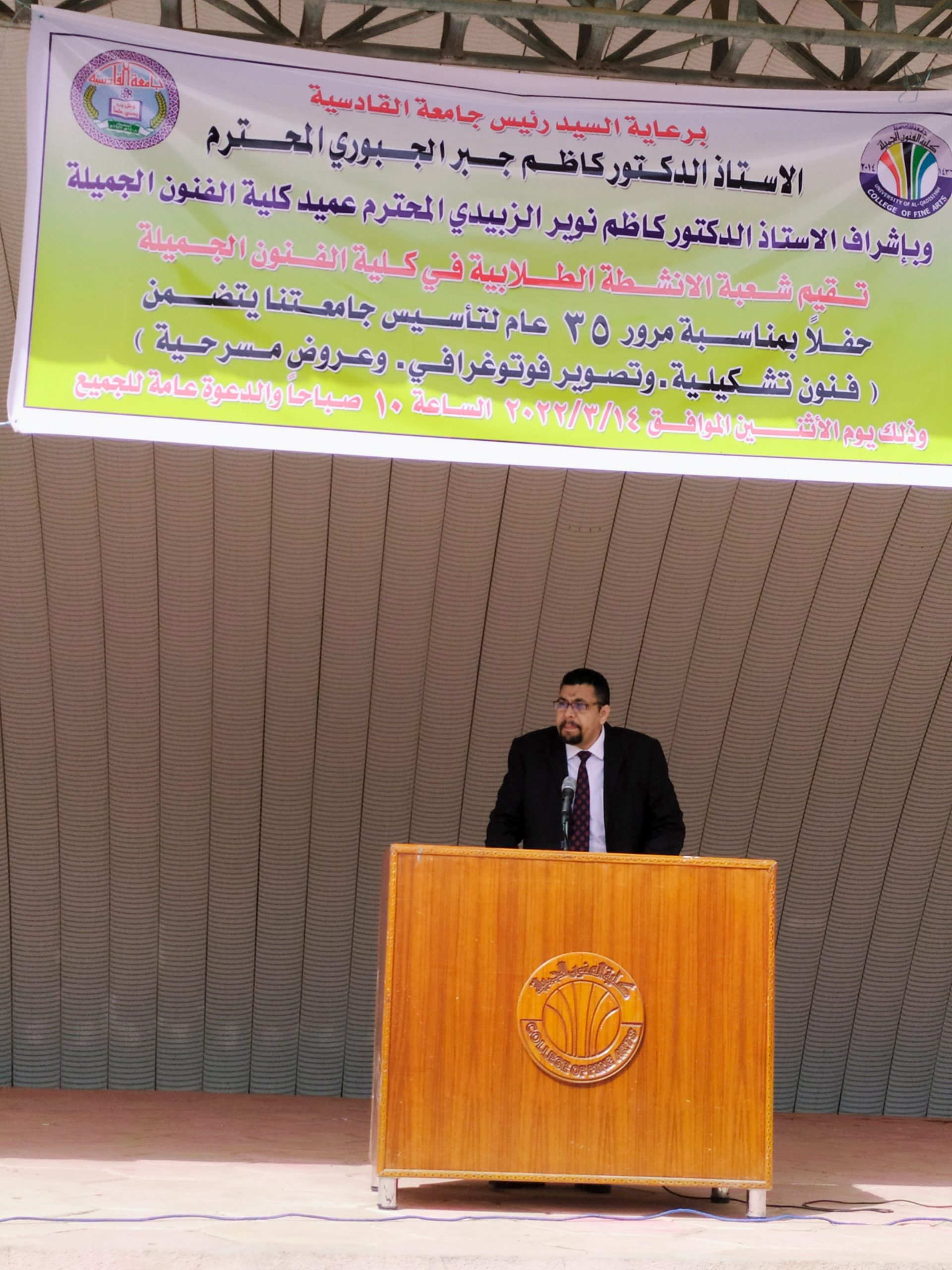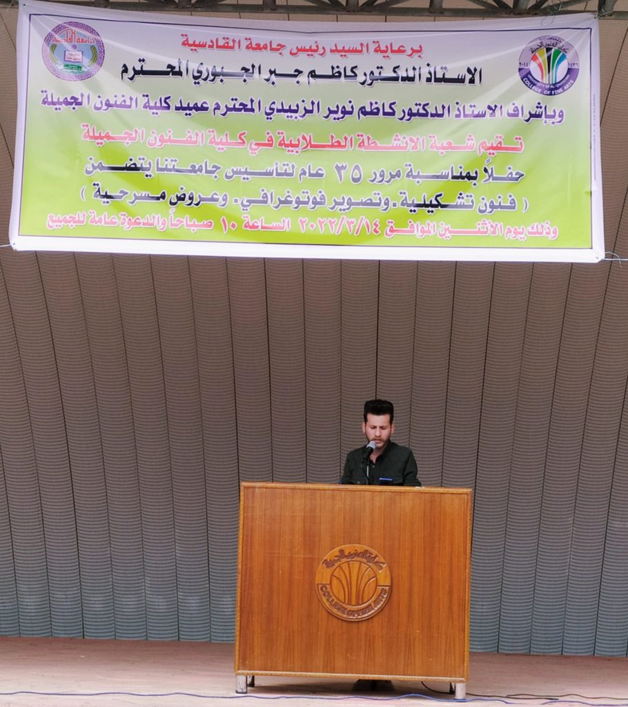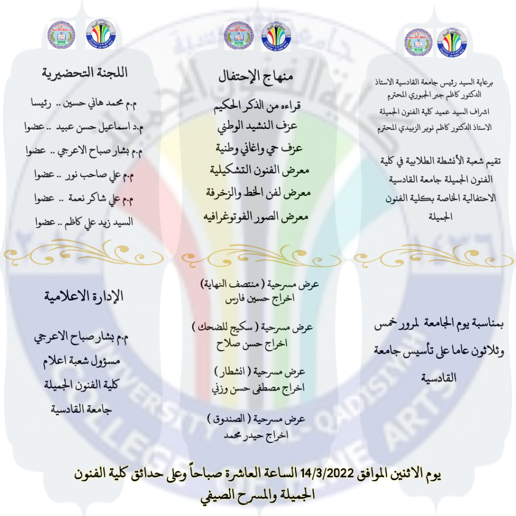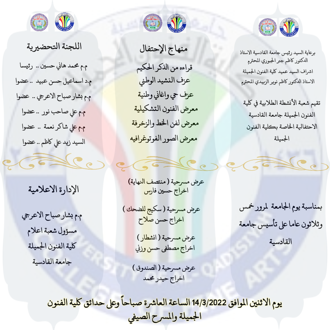 برعاية السيد رئيس جامعة القادسية الاستاذ الدكتور كاظم جبر الجبوري المحترم وأشراف السيد عميد كلية الفنون الجميلة الاستاذ الدكتور كاظم نوير الزبيدي المحترم تقيم شعبة الأنشطة الطلابية في كلية الفنون الجميلة جامعة القادسية بالتعاون مع قسم الفنون المسرحية وقسم التربية الفنية احتفالية يوم الجامعة بمناسبة مرور خمس وثلاثون عاما على تأسيسها.