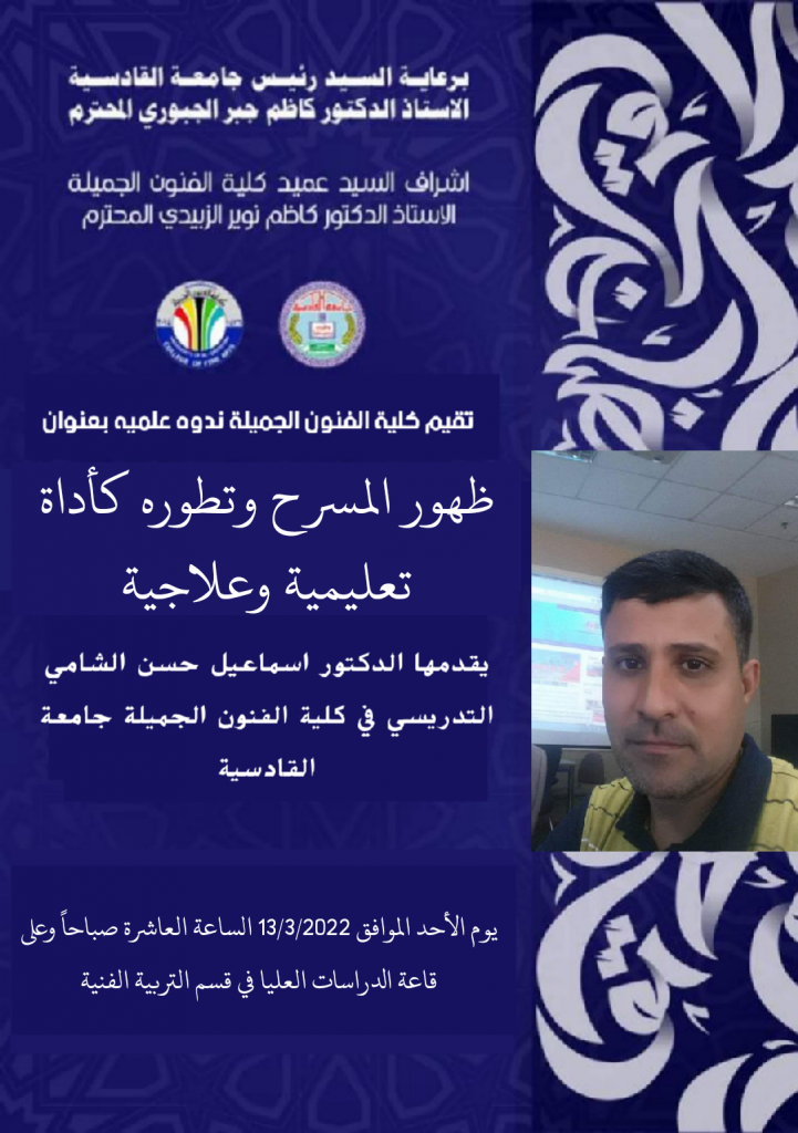 برعاية رئيس جامعة القادسية الاستاذ الدكتور كاظم جبر الجبوري المحترم واشراف السيد عميد كلية الفنون الجميلة الاستاذ الدكتور كاظم نوير الزبيدي المحترم تقيم كلية الفنون الجميلة جامعة القادسية ندوة علمية بعنوان ( ظهور المسرح وتطوره كأداة تعليمية وعلاجية ) والتي يقدمها م.د اسماعيل حسن الشامي التدريسي في كلية الفنون الجميلة جامعة القادسية .