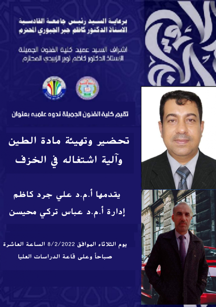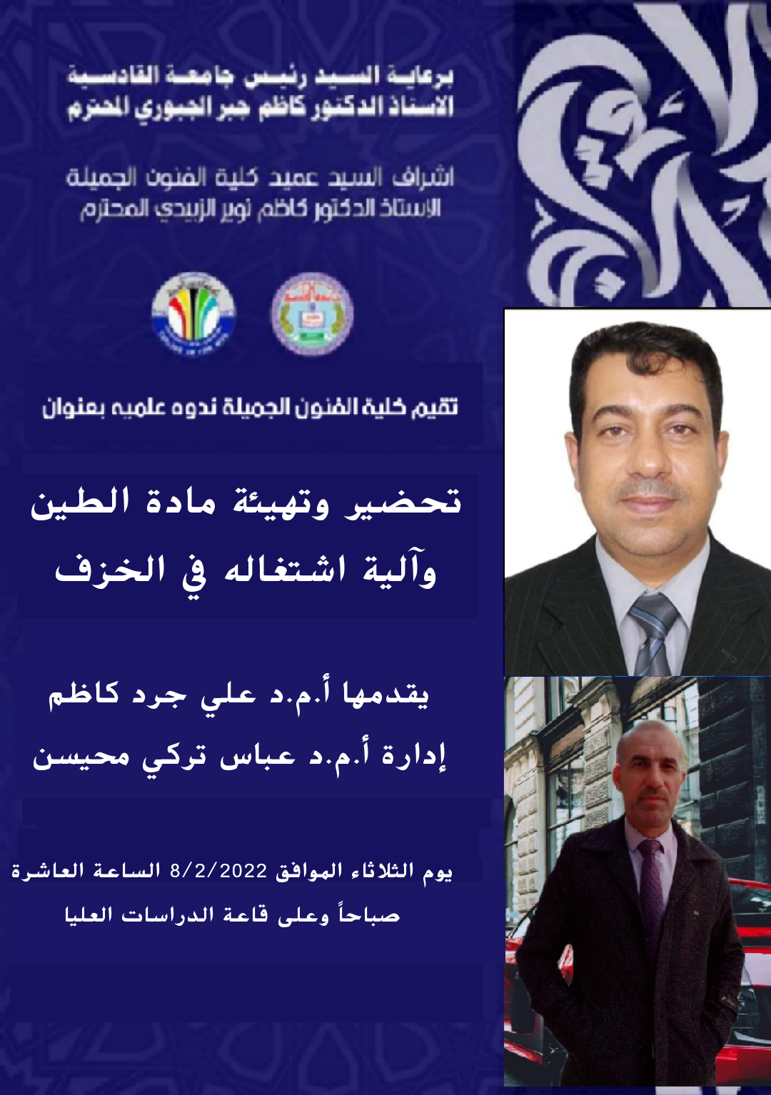 برعاية السيد رئيس جامعة القادسية الاستاذ الدكتور كاظم جبر الجبوري المحترم واشراف السيد عميد كلية الفنون الجميلة الاستاذ الدكتور كاظم نوير الزبيدي المحترم قدمت كلية الفنون الجميلة جامعة القادسية ندوة علمية بعنوان ( تحضير وتهيئة مادة الطين وآلية اشتغاله في الخزف ) والتي قدمها الاستاذ المساعد الدكتور الدكتور علي جرد كاظم وبأدارة وتقديم الاستاذ المساعد الدكتور عباس تركي محيسن .