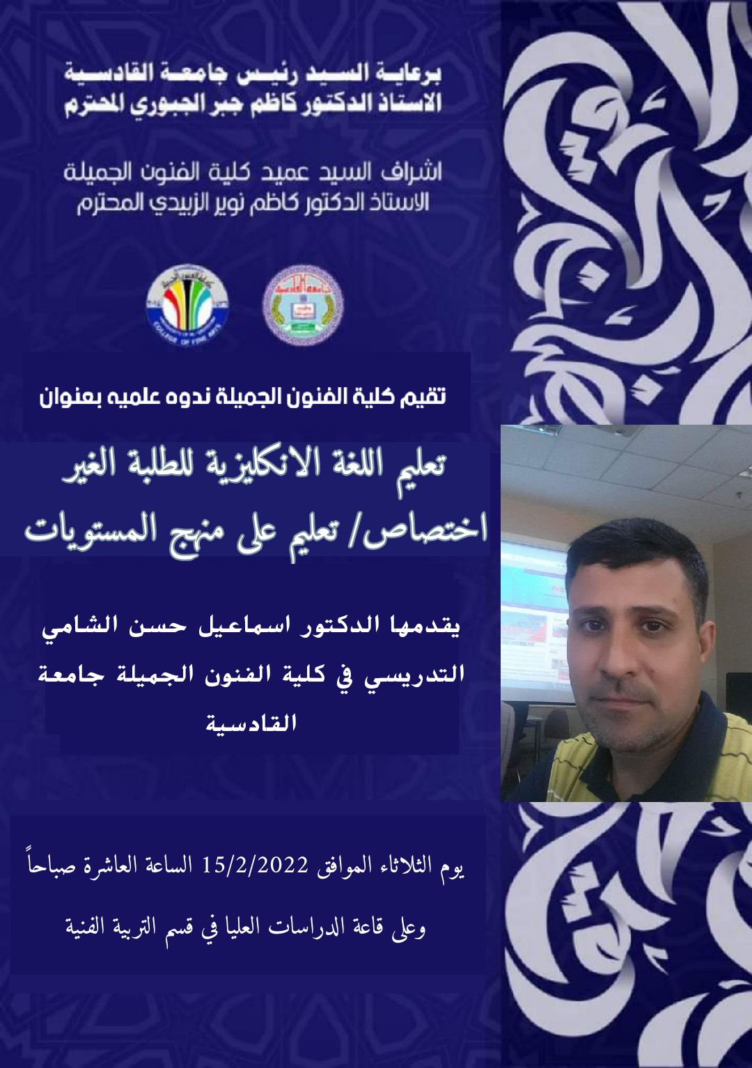 برعاية رئيس جامعة القادسية الاستاذ الدكتور كاظم جبر الجبوري المحترم واشراف السيد عميد كلية الفنون الجميلة الاستاذ الدكتور كاظم نوير الزبيدي المحترم تقدم كلية الفنون الجميلة جامعة القادسية ندوة علمية بعنوان ( تعليم اللغة الانكليزية للطلبة الغير اختصاص/ تعليم على منهج المستويات ) يقدمها الدكتور اسماعيل حسن الشامي التدريسي في كلية الفنون الجميلة جامعة القادسية .