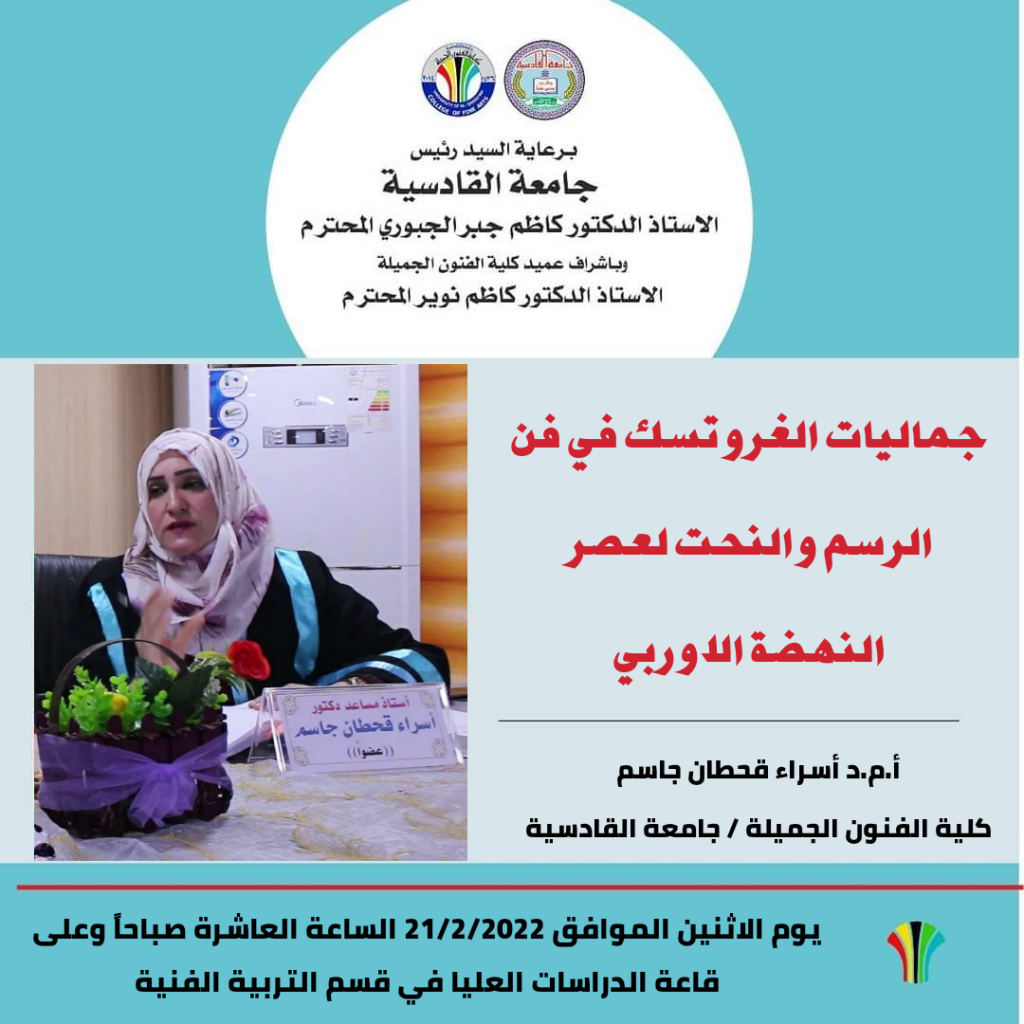 برعاية رئيس جامعة القادسية الاستاذ الدكتور كاظم جبر الجبوري المحترم واشراف السيد عميد كلية الفنون الجميلة الاستاذ الدكتور كاظم نوير الزبيدي المحترم تقيم كلية الفنون الجميلة جامعة القادسية ندوة علمية بعنوان ( جماليات الغروتسك في فن الرسم والنحت لعصر النهضة الاوربي ) والتي تقدمها أ.م.د اسراء قحطان جاسم التدريسية في كلية الفنون الجميلة جامعة القادسية .