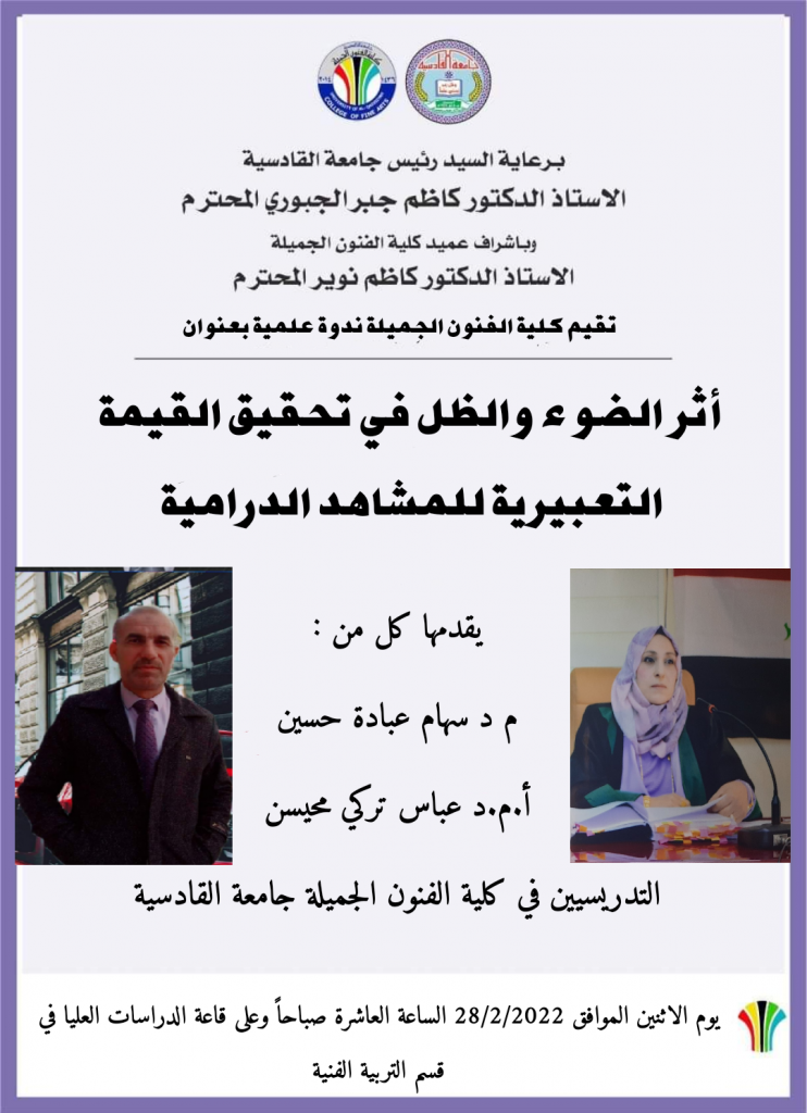 برعاية رئيس جامعة القادسية الاستاذ الدكتور كاظم جبر الجبوري المحترم واشراف السيد عميد كلية الفنون الجميلة الاستاذ الدكتور كاظم نوير الزبيدي المحترم تقيم كلية الفنون الجميلة جامعة القادسية ندوة علمية بعنوان ( أثر الضوء والظل في تحقيق القيمة التعبيرية للمشاهد الدرامية ) والتي تقدمها م.د سهام عبادة حسين و أ.م.د عباس تركي محيسن التدريسيين في كلية الفنون الجميلة جامعة القادسية .