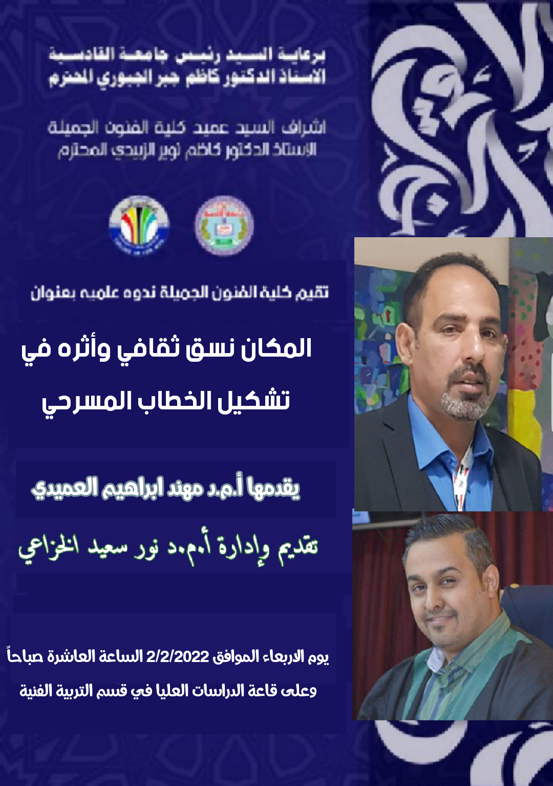 برعاية السيد رئيس جامعة القادسية الاستاذ الدكتور كاظم جبر الجبوري المحترم واشراف السيد عميد كلية الفنون الجميلة الاستاذ الدكتور كاظم نوير الزبيدي المحترم تقيم كلية الفنون الجميلة جامعة القادسية ندوة علمية بعنوان ( المكان نسق ثقافي وأثره في تشكيل الخطاب المسرحي ) والتي يقدمها الاستاذ المساعد الدكتور مهند ابراهيم العميدي وبأدارة وتقديم الاستاذ المساعد الدكتور نور سعيد الخزاعي .