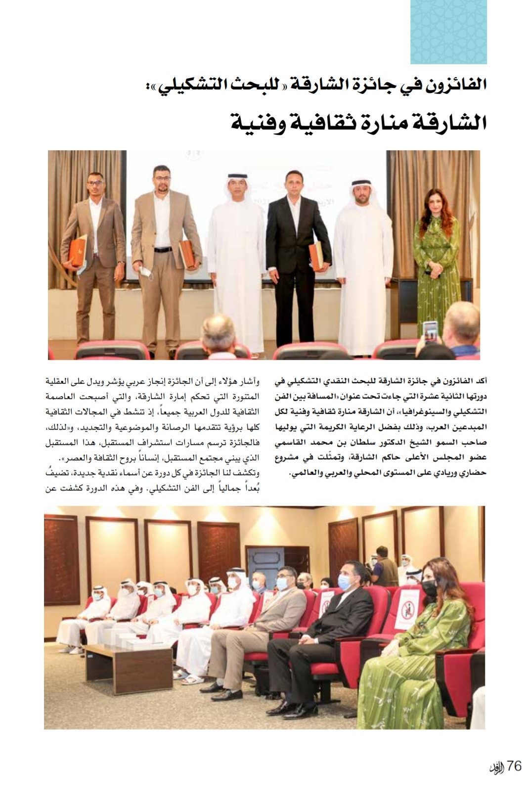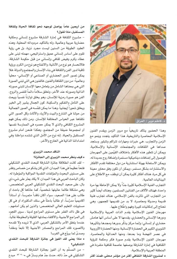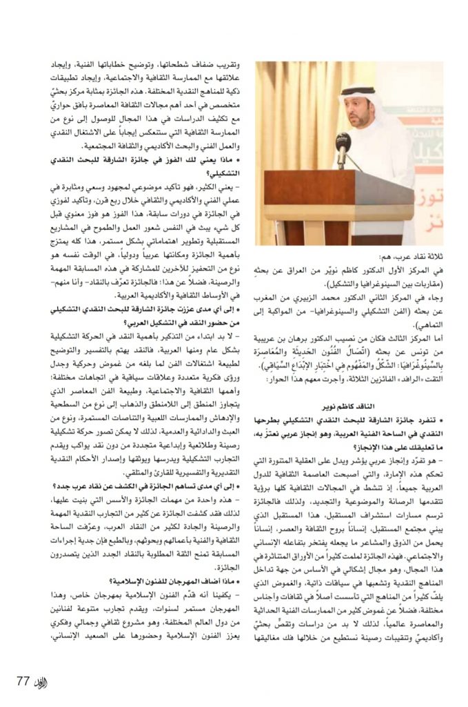 كذلك تناول اللقاء الحديث عن معنى الفوز في جائزة الشارقة للبحث النقدي التشكيلي من منضور الدكتور كاظم نوير ؟ والى أي مدى عززت جائزة الشارقة للبحث النقدي التشكيلي
