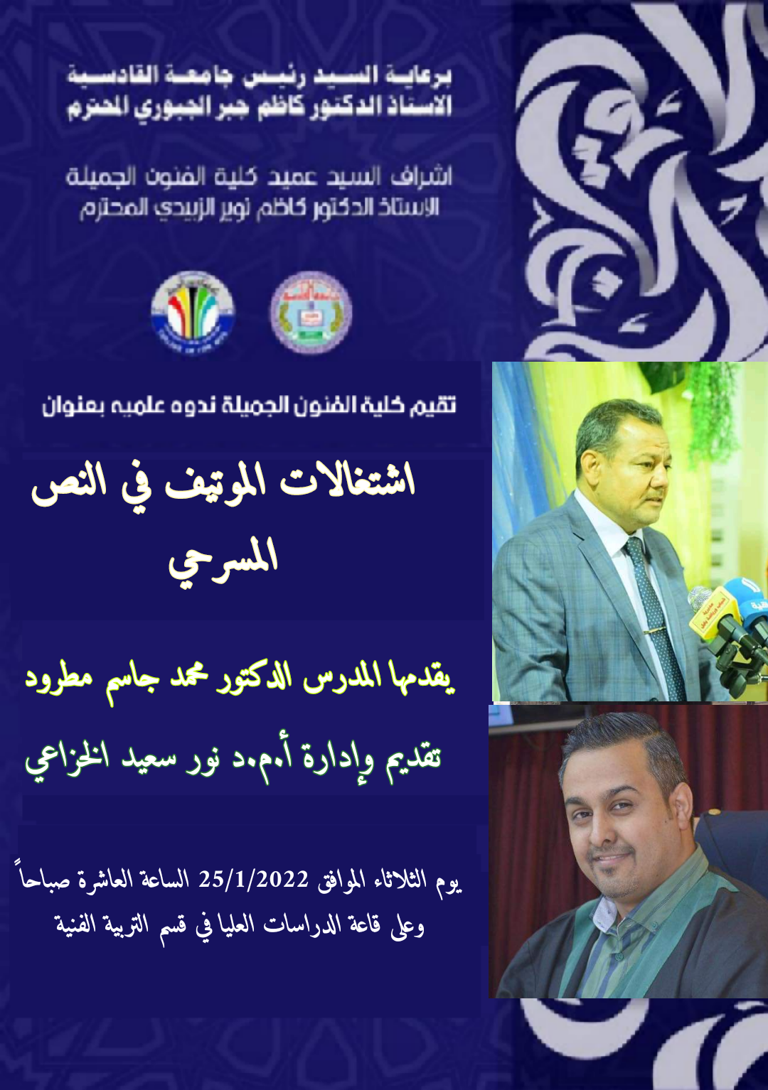 برعاية السيد رئيس جامعة القادسية الاستاذ الدكتور كاظم جبر الجبوري المحترم واشراف السيد عميد كلية الفنون الجميلة الاستاذ الدكتور كاظم نوير الزبيدي المحترم تقيم كلية الفنون الجميلة جامعة القادسية ندوة علمية بعنوان ( اشتغالات الموتيف في النص المسرحي ) والتي يقدمها المدرس الدكتور محمد جاسم مطرود وبأدارة وتقديم الاستاذ المساعد الدكتور نور سعيد الخزاعي وذلك يوم الثلاثاء الموافق 25/1/2022 الساعة العاشرة صباحاً وعلى قاعة الدراسات العليا في قسم التربية الفنية .
