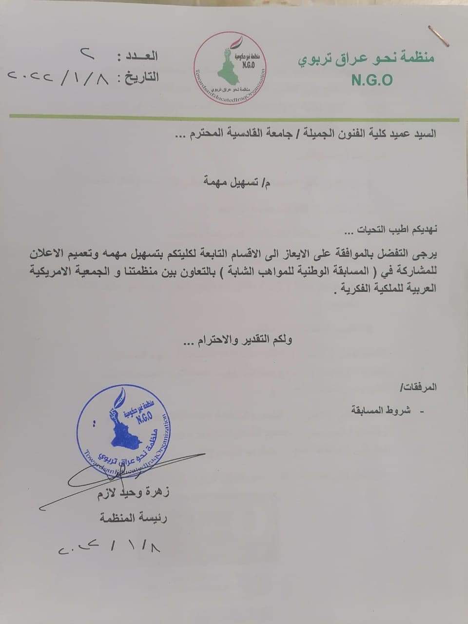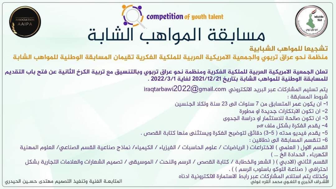 تعلن الجمعية الامريكية العربية للملكية الفكرية ومنظمة نحو عراق تربوي وبالتنسيق مع تربية الكرخ الثانية عن فتح باب التقديم للمسابقة الوطنية للمواهب الشابة بتاريخ 21/12/2021 لغاية 1/3/2022 .