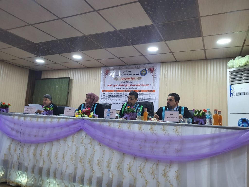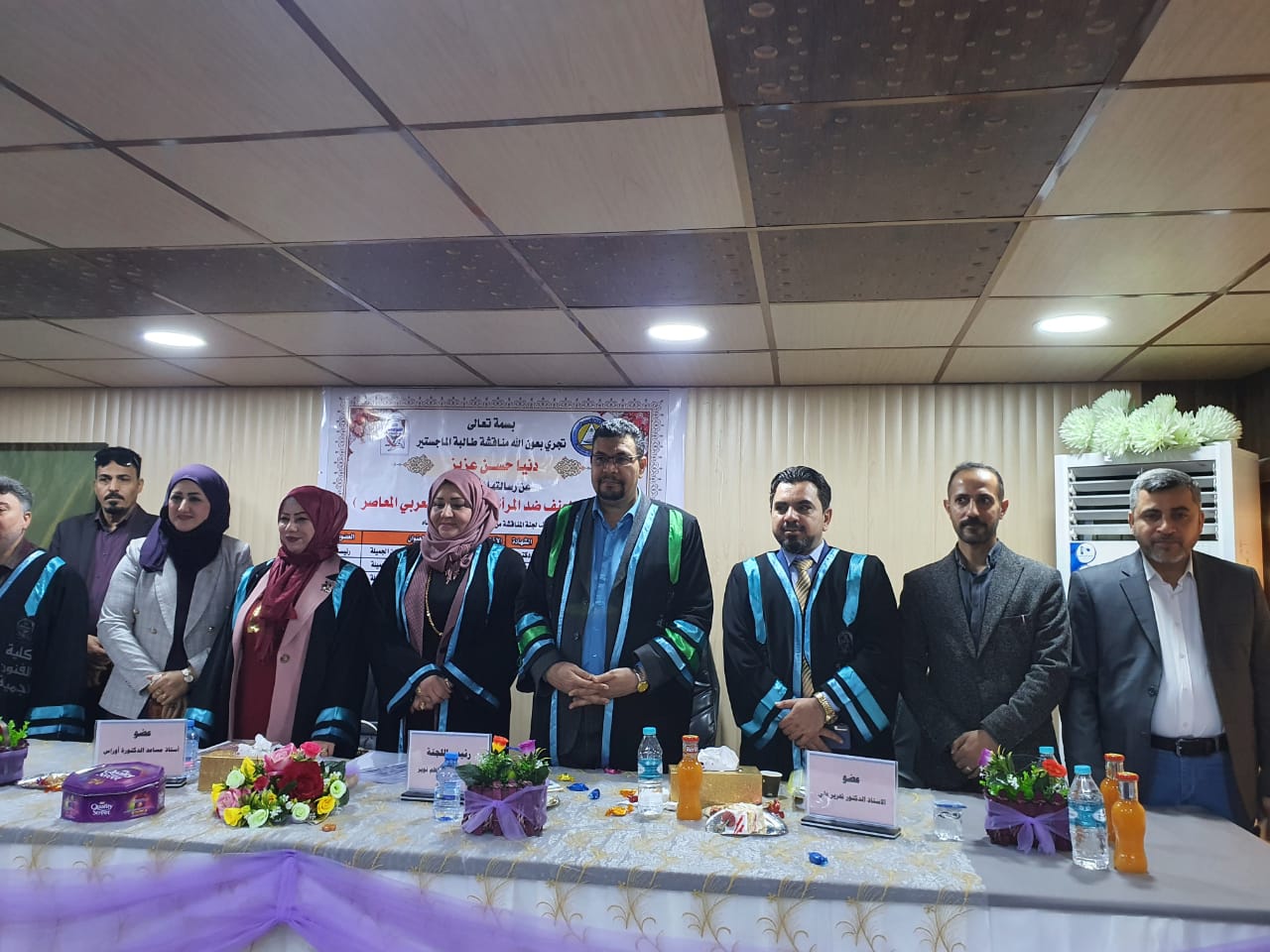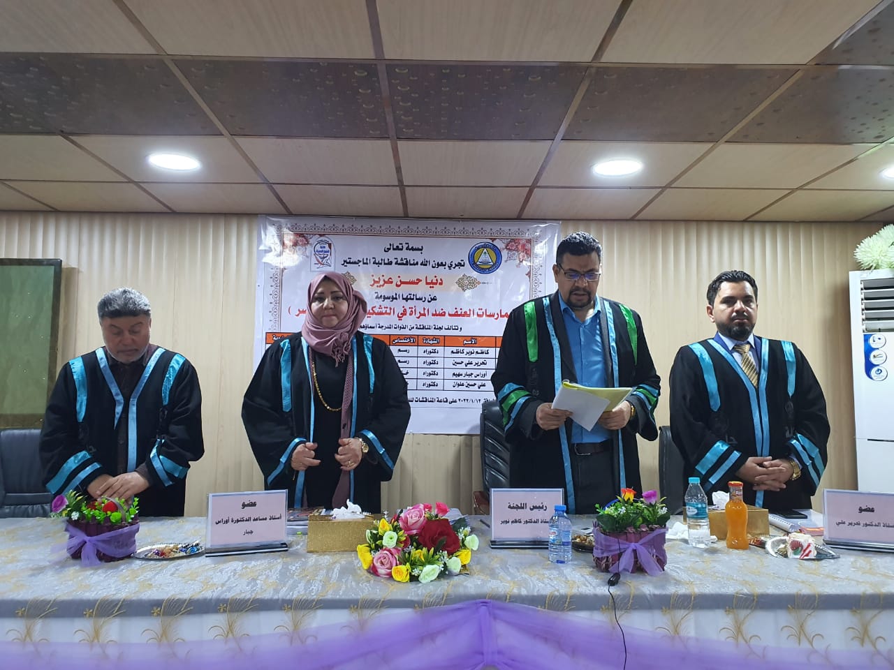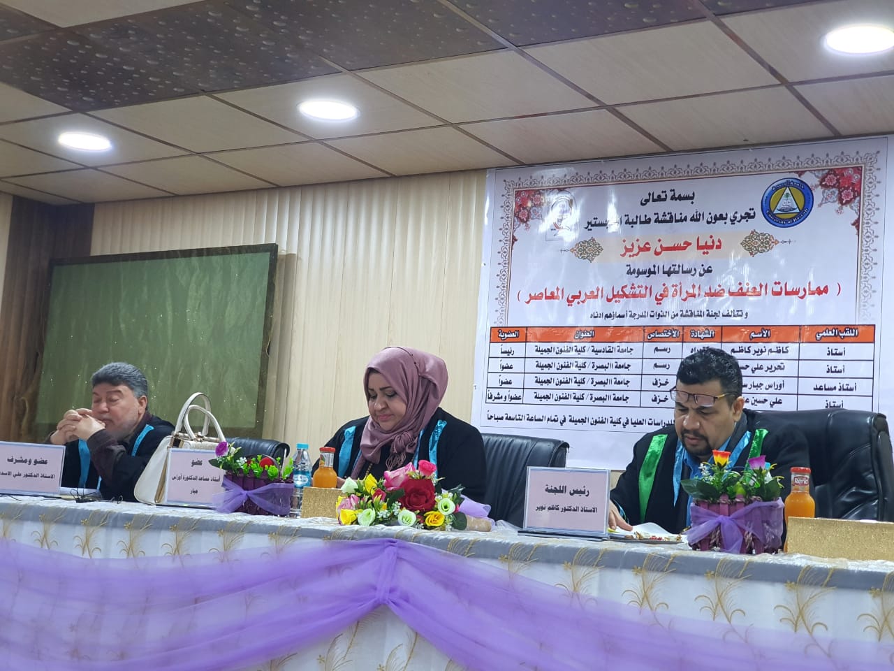 ترأس السيد عميد كلية الفنون الجميلة جامعة القادسية الاستاذ الدكتور كاظم نوير الزبيدي لجنة مناقشة رسالة الماجستير الموسومة ( ممارسة العنف ضد المرأة في التشكيل العربي المعاصر ) للباحثة دنيا حسن عزيز في كلية الفنون الجميلة جامعة البصرة .