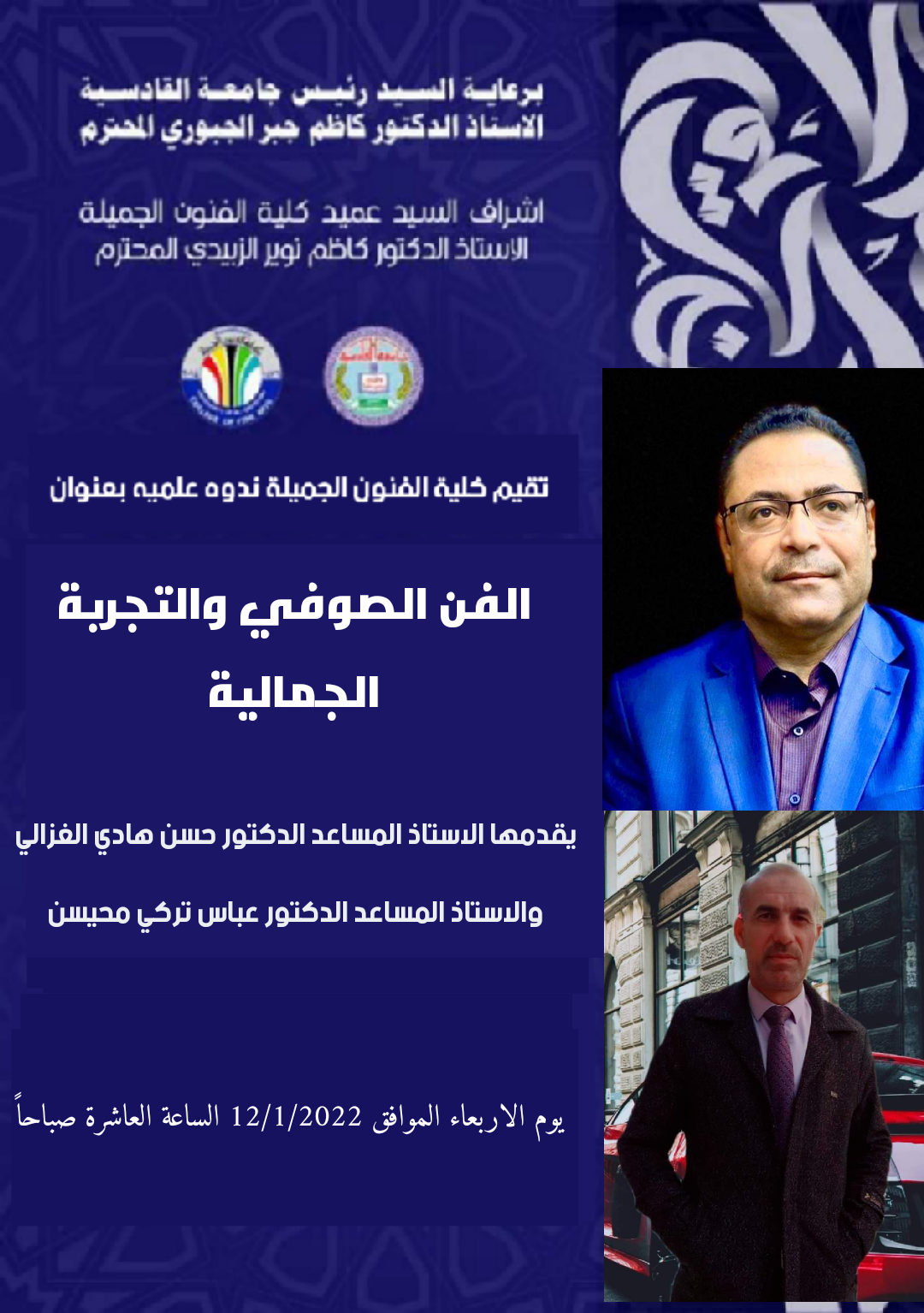 برعاية السيد رئيس جامعة القادسية الاستاذ الدكتور كاظم جبر الجبوري المحترم واشراف السيد عميد كلية الفنون الجميلة الاستاذ الدكتور كاظم نوير الزبيدي المحترم قدمت كلية الفنون الجميلة جامعة القادسية ندوة علمية بعنوان ( الفن الصوفي والتجربة الجمالية ) والتي قدمها الاستاذ المساعد الدكتور حسن هادي الغزالي والاستاذ المساعد الدكتور عباس تركي محيسن .