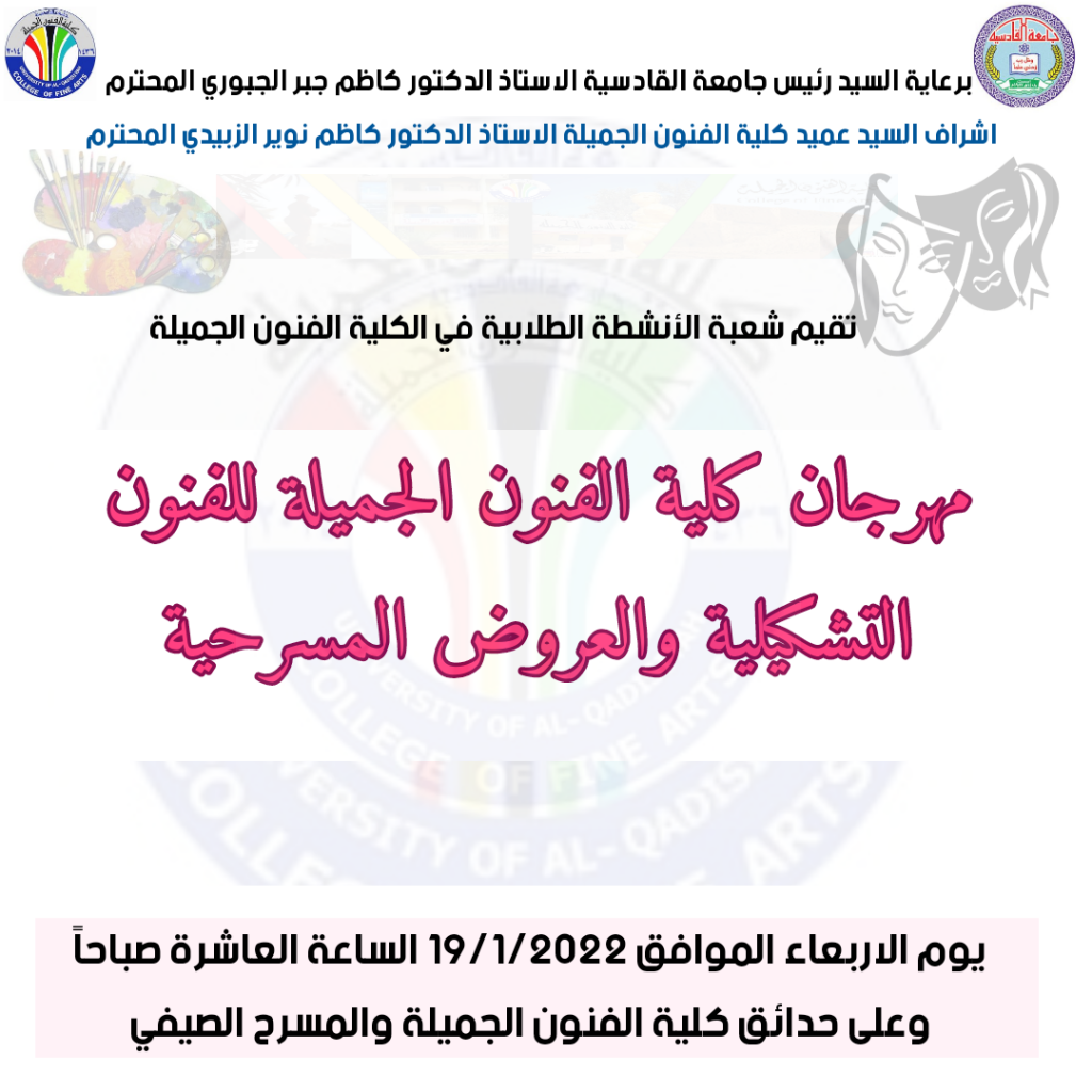 برعاية السيد رئيس جامعة القادسية الاستاذ الدكتور كاظم جبر الجبوري المحترم واشراف السيد عميد كلية الفنون الجميلة الاستاذ الدكتور كاظم نوير الزبيدي المحترم تقيم كلية الفنون الجميلة جامعة القادسية مهرجان كلية الفنون الجميلة للفنون التشكيلية والعروض المسرحية وذلك يوم الأربعاء الموافق 19/1/2022 الساعة العاشرة صباحاً وعلى حدائق كلية الفنون الجميلة والمسرح الصيفي .