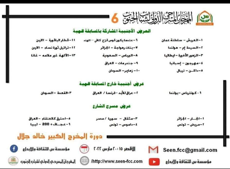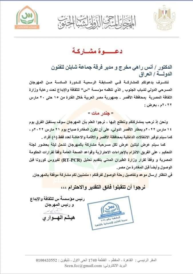 تلقى التدريسي في كلية الفنون الجميلة جامعة القادسية الدكتور أنس راهي علي دعوة للمشاركة في عرض مسرحي من إخراجه بعنوان ” جندر مات ” للمشاركة في المهرجان الدولي المسرحي لشباب الجنوب والذي تنظمه مؤسسة “س” للثقافة والإبداع تحت رعاية وزارة الثقافة المصرية بمحافظة الأقصر جمهورية مصر العربية للفترة من ١٥ حتى ٢٠ مارس ٢٠٢٢ .
