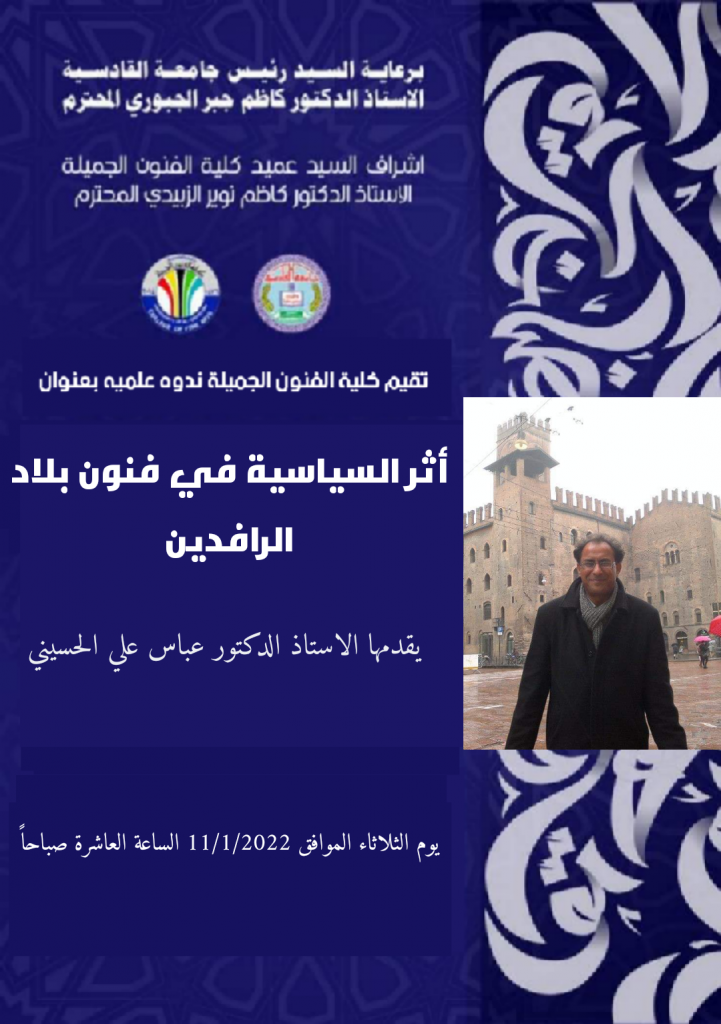 برعاية السيد رئيس جامعة القادسية الاستاذ الدكتور كاظم جبر الجبوري المحترم واشراف السيد عميد كلية الفنون الجميلة الاستاذ الدكتور كاظم نوير الزبيدي المحترم تقيم كلية الفنون الجميلة جامعة القادسية ندوة علمية بعنوان ( أثر السياسية في فنون بلاد الرافدين ) والتي يقدمها الاستاذ الدكتور عباس علي الحسيني وذلك يوم الثلاثاء الموافق 11/1/2022 الساعة العاشرة صباحاً وعلى قاعة الدراسات العليا في قسم التربية الفنية .