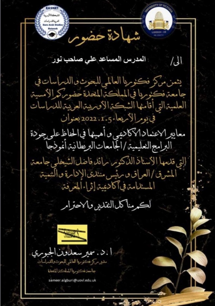 وقد منح شهادة الحضور مركز فكتوريا للبحوث والدراسات التابع لجامعة فكتوريا في المملكة المتحدة عن حضوره الورشة العلمية التي أقامتها الشبكة الأوربية العربية للدراسات وبرعاية مركز فكتوريا الدولي للبحوث و الدراسات في جامعة فكتوريا لندن المملكة المتحدة .