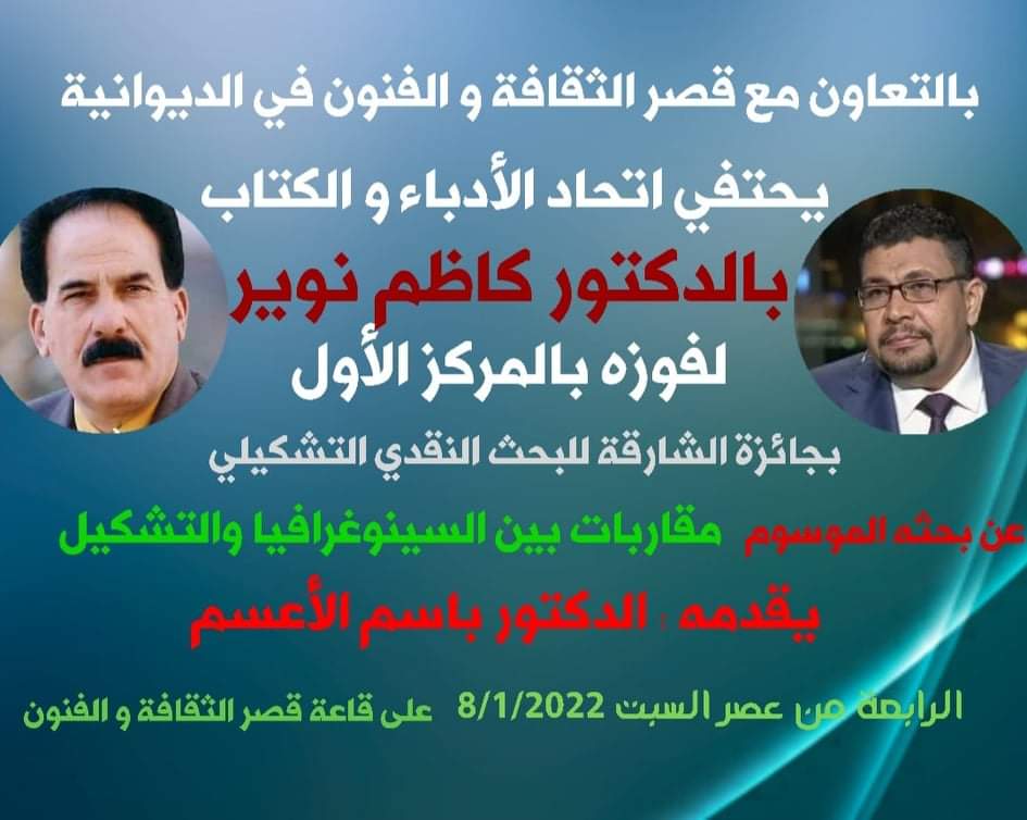يحتفي اتحاد الادباء والكتاب بالتعاون مع قصر الثقافة والفنون في الديوانية بمنجز الاستاذ الدكتور كاظم نوير الزبيدي عميد كلية الفنون الجميلة جامعة القادسية وذلك لفوزه بالمركز الأول بجائزة الشارقة للبحث النقدي التشكيلي عن بحثه الموسوم ( مقاربات بين السينوغرافيا والتشكيل ) وذلك يوم السبت المقبل الموافق 8/1/2022 الساعة الرابعة عصراً على قاعة قصر الثقافة والفنون وسيدير ويقدم الاحتفال الاستاذ الدكتور باسم الاعسم التدريسي في كلية الفنون الجميلة جامعة القادسية .