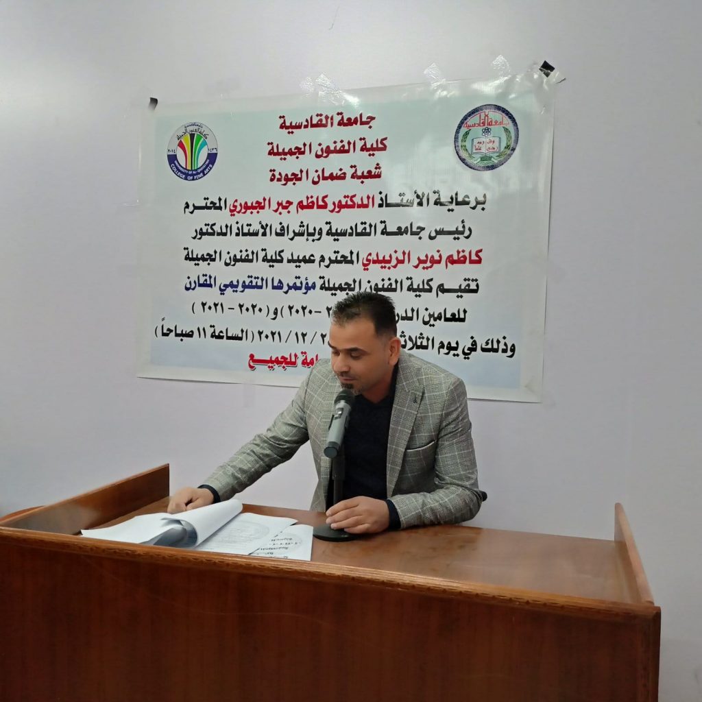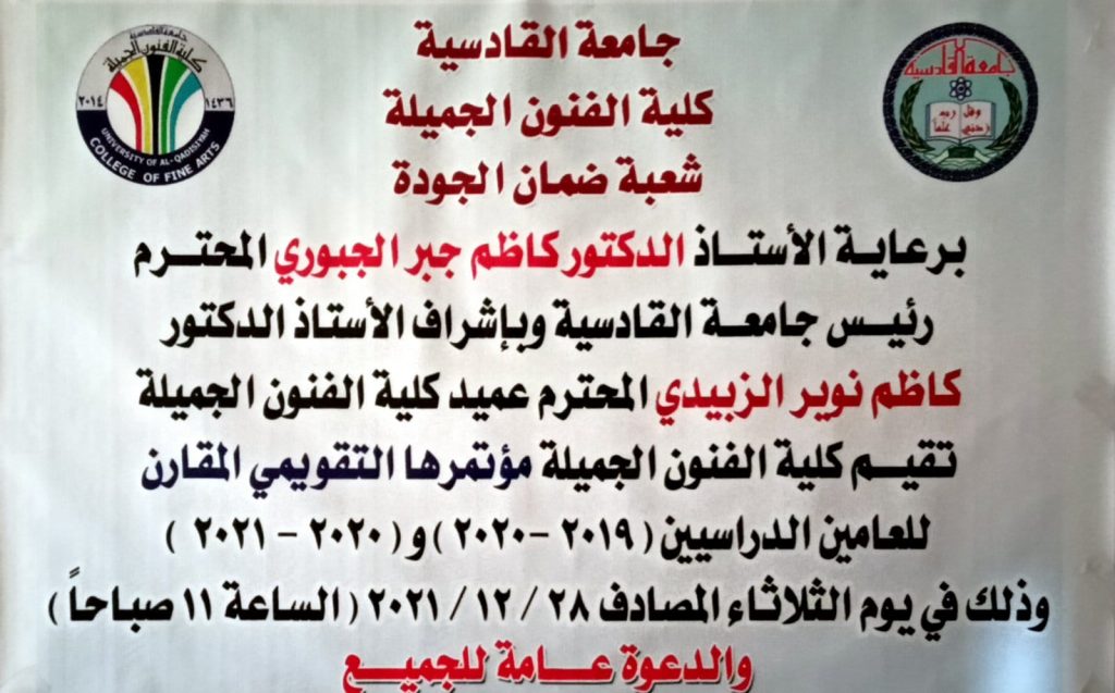 برعاية السيد رئيس جامعة القادسية الاستاذ الدكتور كاظم جبر الجبوري المحترم واشراف السيد عميد كلية الفنون الجميلة الاستاذ الدكتور كاظم نوير الزبيدي المحترم قدمت كلية الفنون الجميلة جامعة القادسية مؤتمرها التقويمي المقارن للعامين الدراسيين ( ٢٠١٩_٢٠٢٠/٢٠٢٠-٢٠٢١ ) والتي أقامتها شعبة ضمان الجودة وتقويم الأداء في كلية الفنون الجميلة وحاضر فيها وادارها المدرس المساعد علي صاحب نور مسؤول شعبة ضمان الجودة وتداخل فيها نخبة من اساتيذ الكلية .