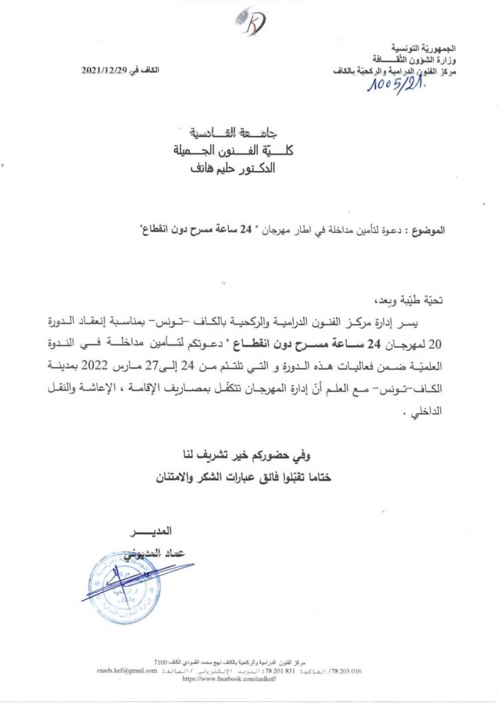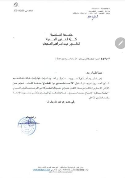 تلقى التدريسيّان في كلية الفنون الجميلة جامعة القادسية الدكتور حليم هاتف والدكتور مهند ابراهيم العميدي دعوة للمشاركة في مهرجان ( 24 ساعة مسرح دون انقطاع) 25 الى27 مارس 2022 والذي ينظمه مركز الفنون الدرامية والركحية بالكاف التابع لوزارة الشؤون الثقافية في الجمهورية التونسية .