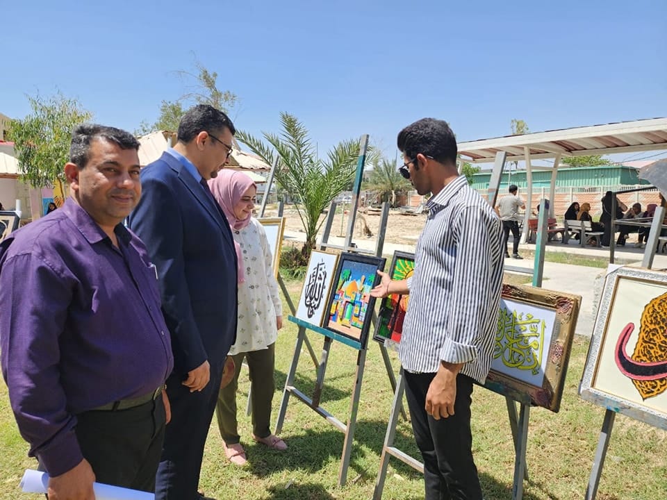 برعاية السيد رئيس جامعة القادسية الاستاذ الدكتور كاظم جبر الجبوري المحترم وباشراف وحضور السيد عميد كلية الفنون الجميلة الاستاذ الدكتور كاظم نوير الزبيدي المحترم وبحضور السيد معاون العميد العلمي الاستاذ الدكتور علي جرد الحميري المحترم ونخبة من اساتذة وطلبة القسم والكلية. اقيم في صباح يوم الاحد الموافق 2023/5/14 في رحاب حدائق الكلية معرضا فنيا في مادة الاشغال اليدوية لطلبة المرحلة الثانية الدراسة الصباحية باشراف التدريسية (م.م.جمانة محمد خليل) وقد ضم المعرض مجموعة مختلفة من نتاجات الطلبة من الاعمال والاشغال اليدوية الفنية التي توزعت بين (رسم على الزجاج، حرق على الخشب، طباعة ملونة على الخشب، رسم شخصيات بالوان البوية على الزجاج) فضلا عن مجموعة من اللوحات الفنية الزيتية وغيرها التي اضفت نوعا من التنوع الفني الجميل في الاعمال المشاركة. وقد اشاد السيد عميد الكلية بالمعرض مثمنا الجهود المبذولة من قبل تدريسي المادة ورئاسة القسم لما لمسه من تطور في امكانيات الطلبة الفنية نحو مزيد من العطاء العلمي والفني.