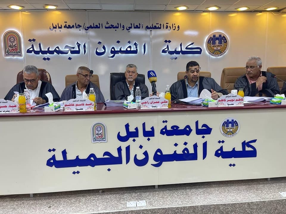 برعاية السيد رئيس جامعة القادسية الاستاذ الدكتور كاظم جبر الجبوري المحترم وبحضور واشراف السيد عميد كلية الفنون الجميلة الاستاذ الدكتور كاظم نوير الزبيدي المحترم والسيد معاون العميد العلمي الاستاذ المساعد الدكتور علي جرد الحميري والسيد رئيس قسم التربية الفنية الاستاذ المساعد الدكتور عباس تركي الجبوري المحترمون ، وفي صباح يومي الاثنين والثلاثاء (15-16) من شهر ايار 2023 باشرت لجان مناقشة مشاريع بحوث تخرج طلبة المرحلة الرابعة في قسم التربية الفنية عملها في مناقشة بحوث تخرج الطلبة في اجواء علمية رصينة بعد تقسيم الطلبة الى عدة مجاميع وتوزيعهم على اللجان المختلفة المشكلة من قبل لجنة بحوث مشاريع التخرج في قسم التربية الفنية. وقد تالفت لجنة مناقشة بحوث الموضوعات الفنية من السادة التدريسيين: الاستاذ المساعد الدكتور محمد عبيد ناصر رئيسا وعضوية كل من الاستاذ المساعد الدكتور وميض سمير هادي والاستاذ المساعد الدكتور احمد علي كاظم. في حين تالفت لجنة مناقشة بحوث الموضوعات الفنية ذات الطابع المسرحي من السادة التدريسيين : الاستاذ المساعد الدكتور علاء عبد الكاظم الركابي رئيسا وعضوية كل من الاستاذ المساعد الدكتور محمد جاسم الشبيلي والدكتور اياد طارش ساجت. وقد وجه السيد العميد الاستاذ الدكتور كاظم نوير الزبيدي المحترم على ان تكون عملية المناقشة علمية وبناءة ودقيقة تخدم رصانة وجودة البحث العلمي ومشاريع بحوث التخرج. وقد تناولت بحوث تخرج الطلبة موضوعات علمية وفنية متنوعة. وكانت اجواء المناقشات العلمية يسودها التفاعل والتنافس العلمي المتميز بين الطلبة والذي اعطى صورة مشرقة لطلبة كلية الفنون الجميلة.