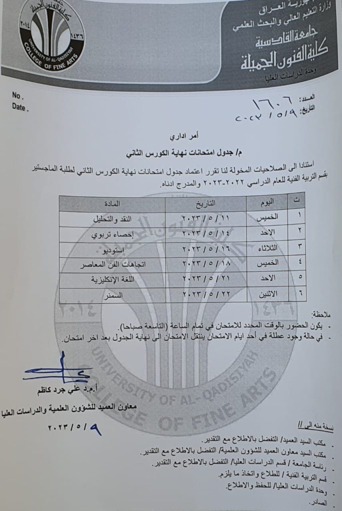 برعاية ودعم السيد العميد الاستاذ الدكتور كاظم نوير الزبيدي والجهود المبذولة من قبل السيد رئيس قسم التربية الفنية الاستاذ المساعد الدكتور عباس الجبوري واساتذة القسم للدراسات العليا الماجستير انهى قسم التربية الفنية الاستعدادات الخاصة بالدراسات العليا / الماجستير من خلال نشر المحاور الضرورية للامتحان التنافسي وتهيئة واتمام انجاز الاسئلة الخاصة بذلك، كما اعلن القسم بداية الدراسة في الفصل الدراسي الثاني بتاريخ 2023/1/22 الموافق يوم الاحد