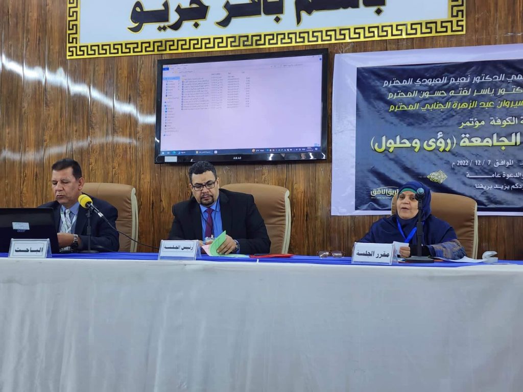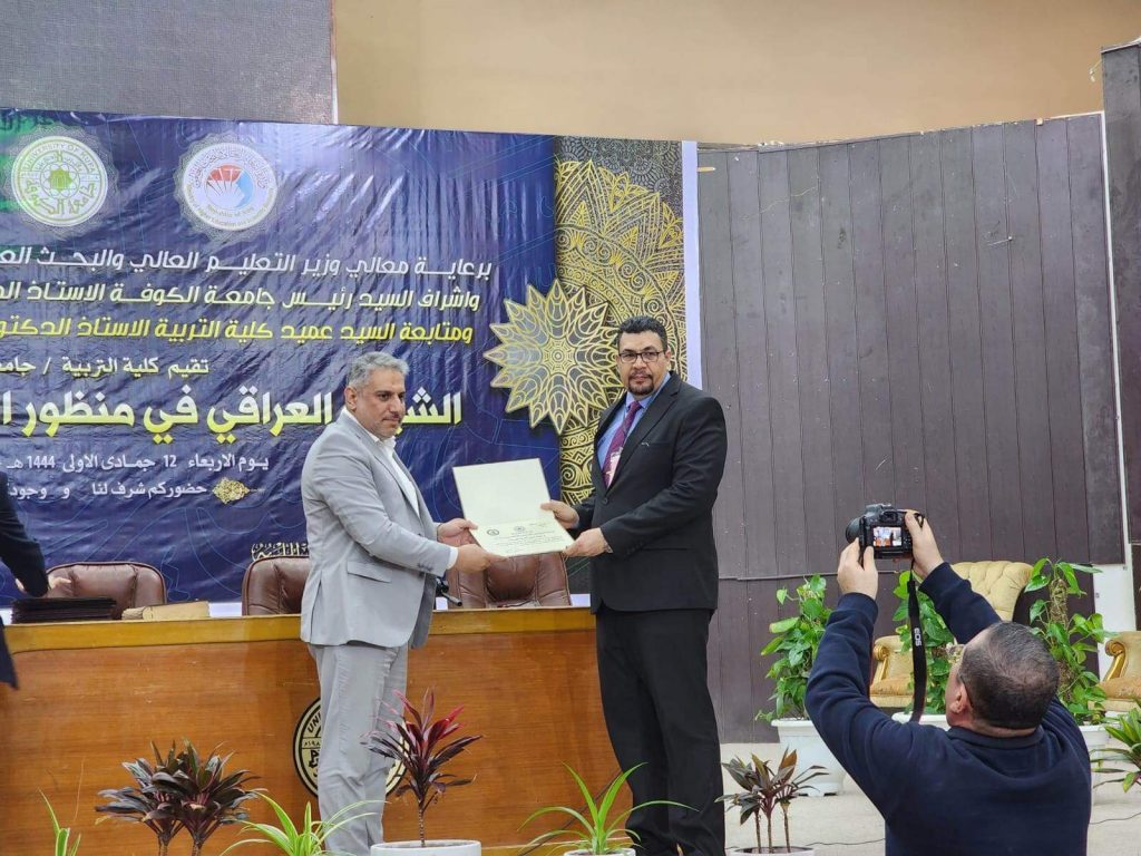 وفي نهاية المؤتمر تم تكريم الاستاذ الدكتور كاظم نوير الزبيدي لادارته جلسات المؤتمر ومناقشة الباحثين. .Dean. of the College of Fine Arts, University of Al-Qadisiyah, participates in chairing and managing the sessions of the conference of the College of Mixed Education, University of Kufa (Youth Visions and Solutions).The Honorable Dean of the Faculty of Fine Arts, Professor Dr. Kazem Noir Al-Zubaidi, participated in the activities of the Iraqi Youth Conference in the perspective of the university, visions and solutions, and under the slogan (Let us work on preparing a conscious young man for a promising future).Where Dr. Kazem Noir Al-Zubaidi chaired the conference research discussion sessions, which aimed to identify the current challenges and problems facing youth, the psychological, social and cultural needs of Iraqi youth, show the importance of Iraqi youth, strengthen the status of universities, and identify the strengths of Iraqi youth by examining successful youth experiences at the local, Arab and international levels. The conference included a discussion of the religious, political, intellectual, psychological, educational, literary, artistic, legal, health, media and social aspects.At the end of the conference, Prof. Dr. Kazem Noir Al-Zubaidi was honored for managing the conference sessions and discussing the researchers.