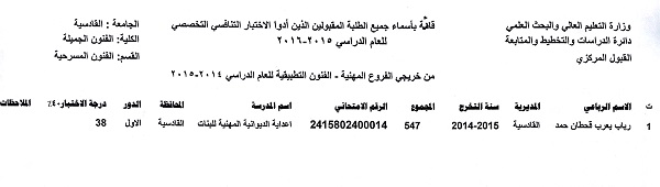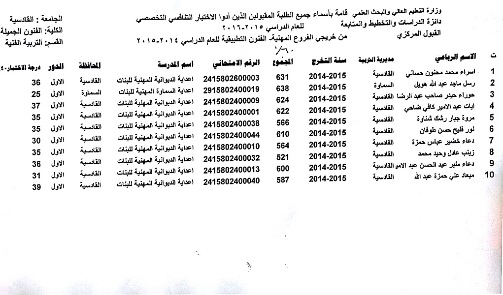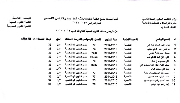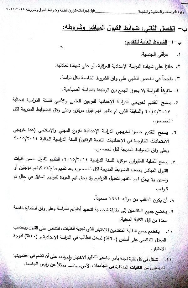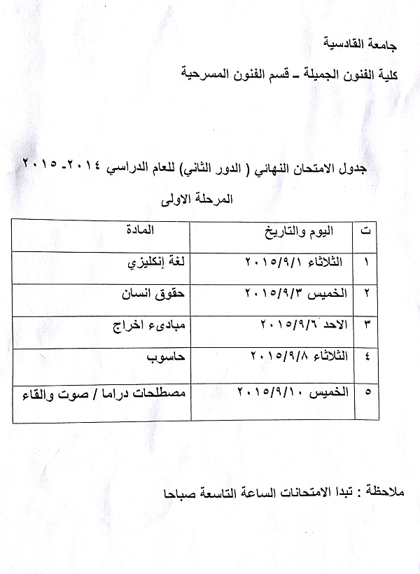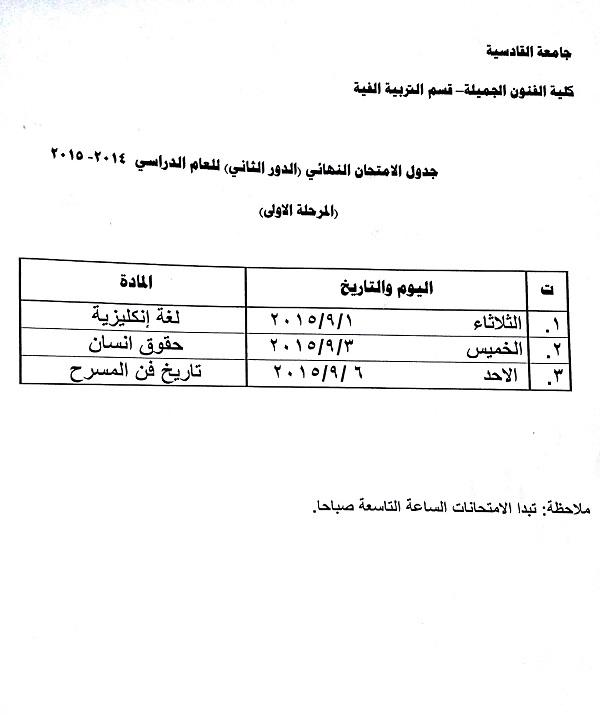 الى كافة الطلبة الراغبين بالتقديم المباشر الى كلية الفنون الجميلة والذين تتوفير فيهم شروط القبول المدرجة ادناه مراجعة عمادة كلية الفنون الجميلة شعبة التسجيل لملئ الاستمارات الخاصة والاطلاع على شروط التقديم علما ان باب التقديم يفتح بتاريخ 12-8-2015 ولغاية فتره اقصاها 10 -9-2015 .