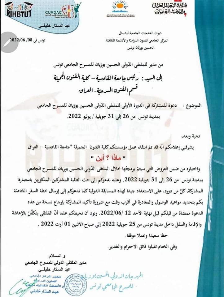 تلقت كلية الفنون الجميلة جامعة القادسية دعوة للمشاركة في الملتقى الدولي الحسين بوزيان للمسرح الجامعي في تونس للفترة 26-31 / 7 /2022 .