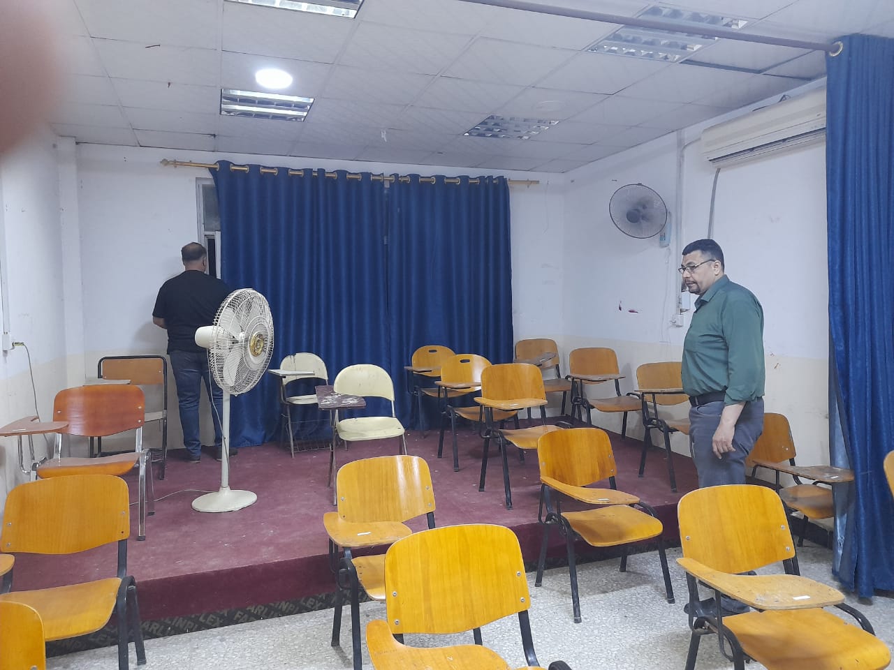وكذلك تفقد استعدادية منظومة الدفاع المدني للحالات الطارئة وكذلك منظومة كاميرات المراقبة وفحص أجهزة التبريد واطلع من خلال جولته في القاعات الإمتحانية على مستوى إستعداد الكلية لإجراء الإمتحانات مبينا ان ملاكات الكلية تبذل كل الجهود في إنجاح العملية الإمتحانية متمنيا لابناءه الطلبة الموفقية والنجاح.