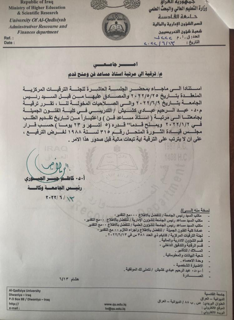 هنأ السيد عميد كلية الفنون الجميلة الاستاذ الدكتور كاظم نوير الزبيدي المحترم الأستاذ المساعد الدكتور عبد الرحيم عبادي كشيش التدريسي في كلية الفنون الجميلة جامعة القادسية بمناسبة ترقيته إلى مرتبة استاذ مساعد فن .