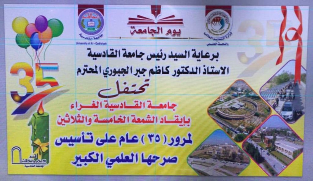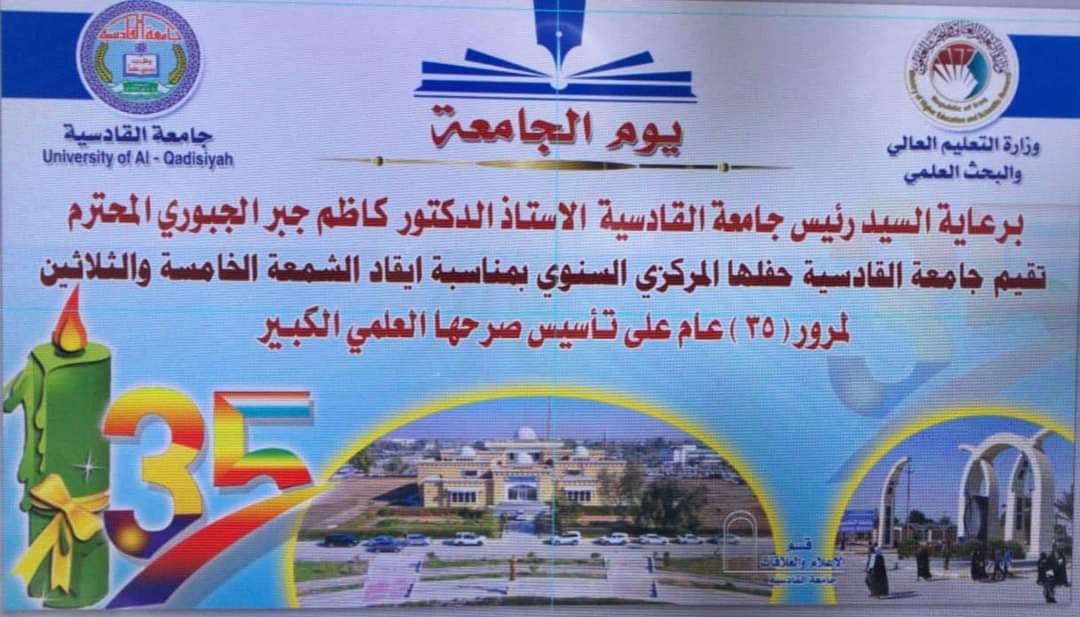 برعاية السيد رئيس جامعة القادسية الأستاذ الدكتور كاظم جبر الجبوري المحترم وتزامناً مع أفراح شعبان المجيدة تقيم جامعة القادسية الغرّاء حفلها المركزي السنوي بمناسبة إيقاد الشمعة الخامسة والثلاثين لمرور (35) عام على تأسيس صرحها العلمي الكبير وذلك في صباح يوم الأربعاء الموافق 9 /3 /2022