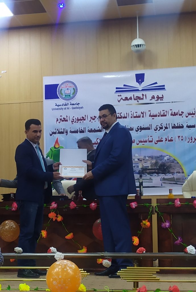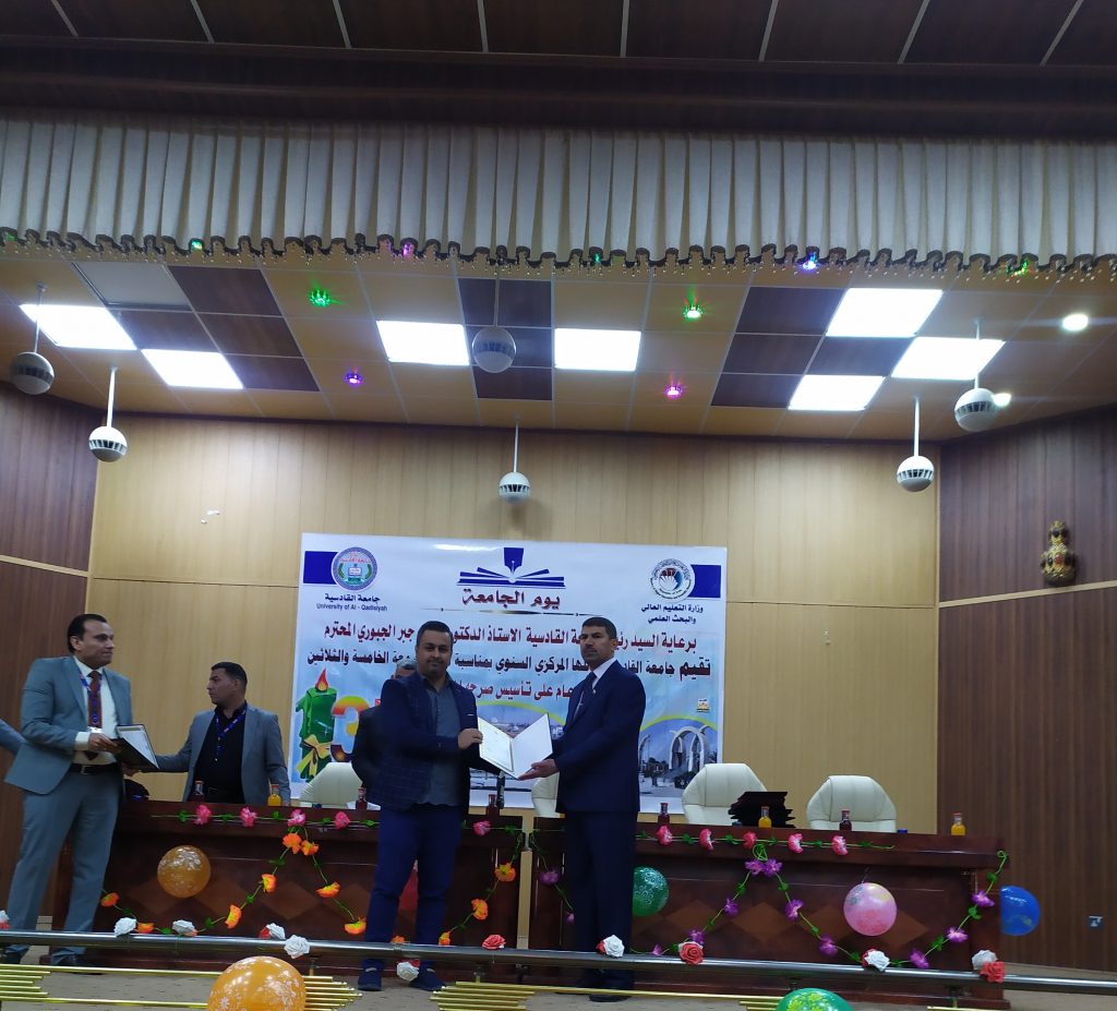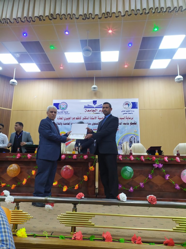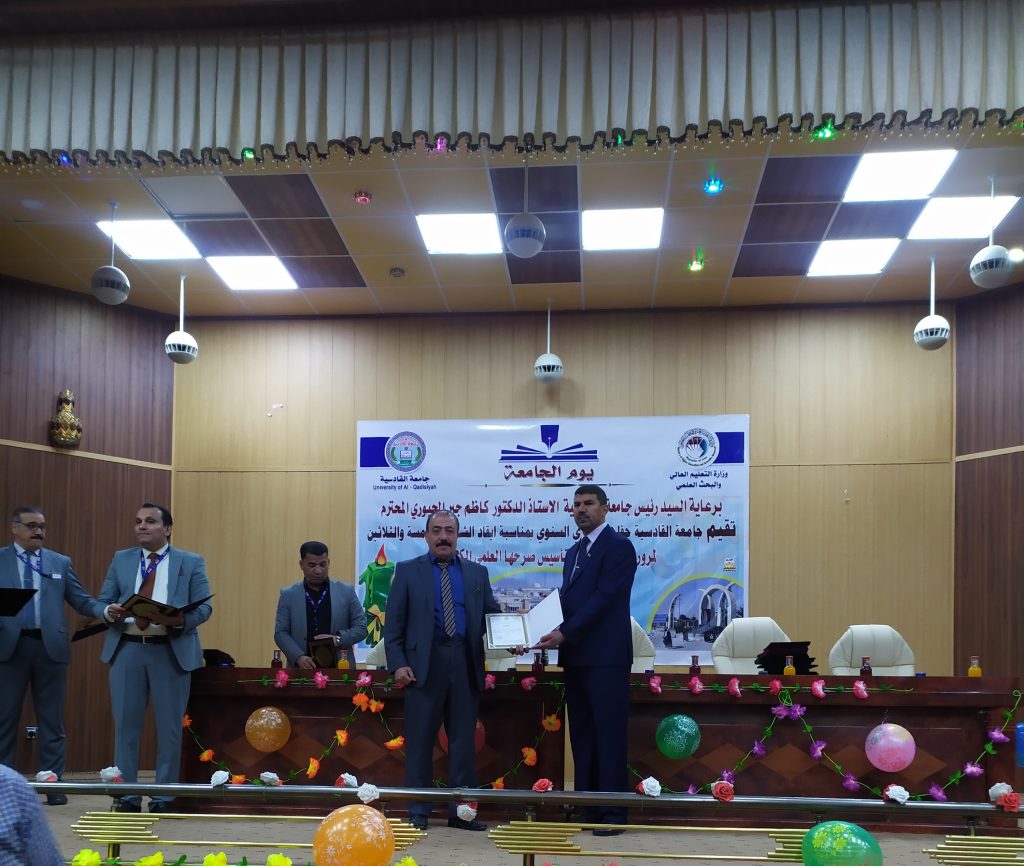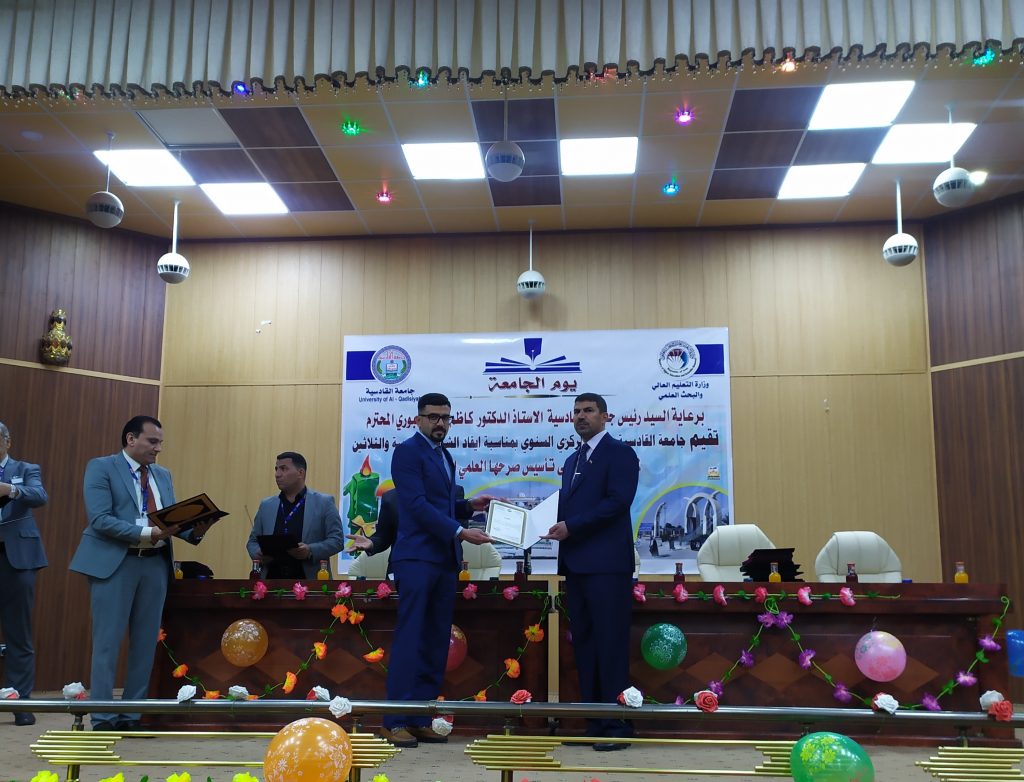 هذا وقد شهد الاحتفال تكريم القامات العلمية المميزة في الجامعة وكذلك الموظفين المتميزين ومنحهم كتاب شكر وتقدير من السيد رئيس الجامعة وكان لكلية الفنون الجميلة جامعة القادسية مكانة متميزة بحصولها على كتب شكر وتقدير متمثلتا بحصول قسم التربية الفنية في الكلية على المركز الأول على الكليات المناضرة لها في جامعات العراق وكذلك تكريم اساتيذها المتميزين .