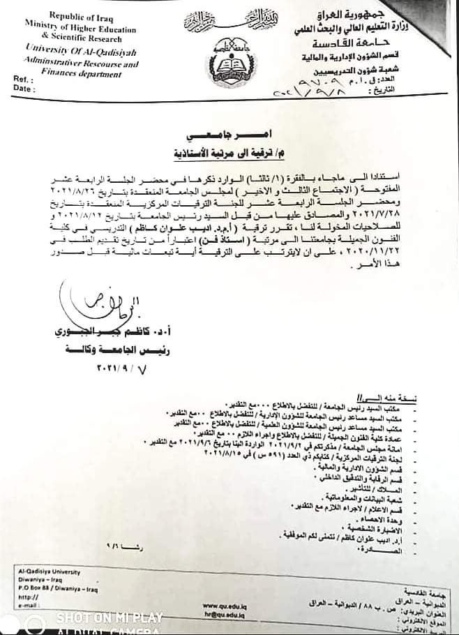 هنأ السيد عميد كلية الفنون الجميلة الاستاذ الدكتور كاظم نوير المحترم الأستاذ الدكتور اديب علوان كاظم التدريسي في كلية الفنون الجميلة جامعة القادسية بمناسبة ترقيته إلى مرتبة استاذ فن مثمنا جهوده العلمية المبذولة في سبيل حصوله على الترقية ..ألف مبارك والى مزيد من التقدم العلمي خدمة لكليتنا وجامعتنا العزيزة وعراقنا الحبيب