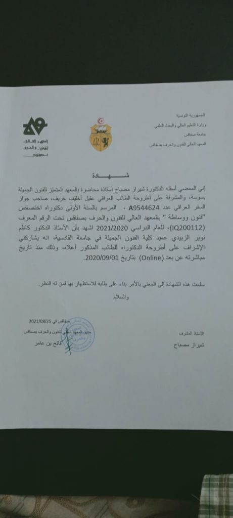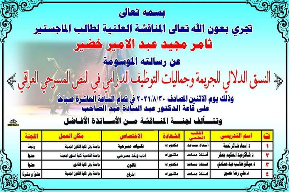 اشترك التدريسي في كلية الفنون الجميلة جامعة القادسية الاستاذ المساعد الدكتور شاكر عبد العظيم جعفر عضوا مناقشا لرسالة الماجستير الموسومة ( النسق الدلالي للجريمة وجماليات التوظيف الدرامي في النص المسرحي العراقي) للباحث ( ثامر مجيد عبد الامير) وتألفت لجنة المناقشة من :