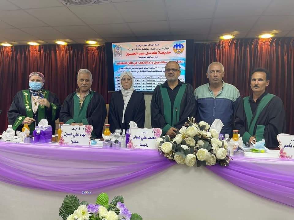 اشترك التدريسي في كلية الفنون الجميلة جامعة القادسية الاستاذ المساعد الدكتور محمد عبيد ناصر عضوا مناقشا لرسالة الماجستير الموسومة ( جدلية الديني والدنيوي وتمثلاتها في الفن المعاصر ) للباحثة خديجة كامل عبد الحسين الشيخ .