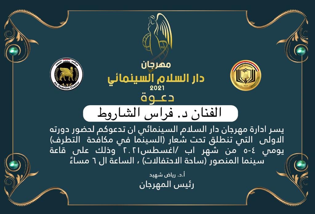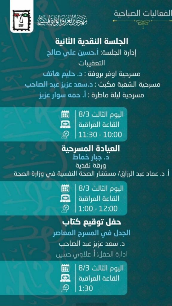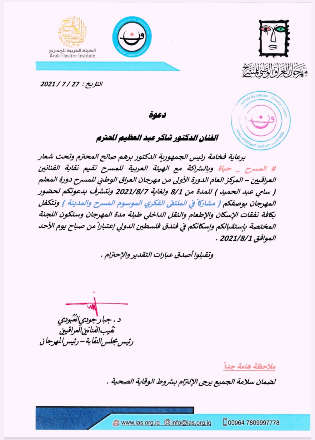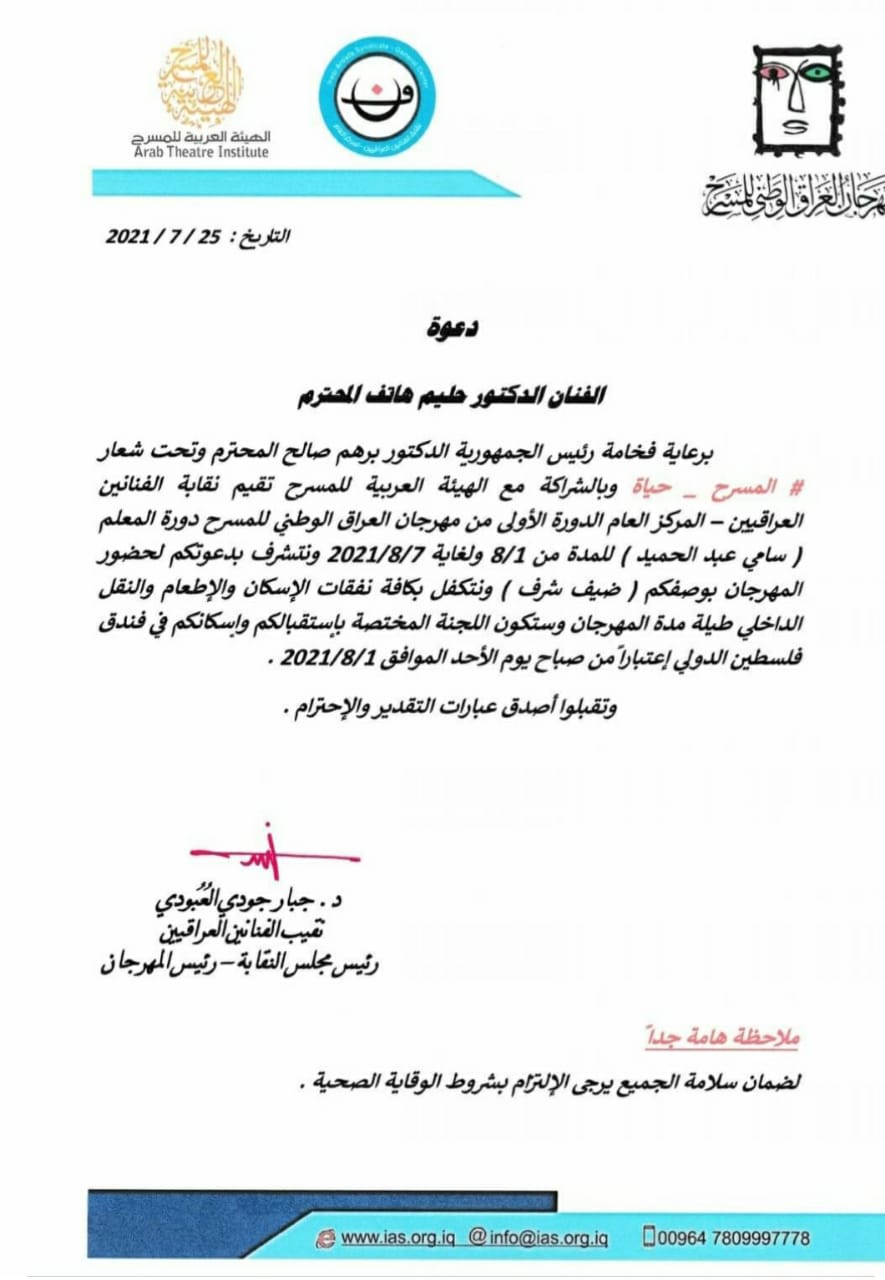 بدعوة من نقابة الفنانين العراقيين سيشارك الدكتور حليم هاتف التدريسي في كلية الفنون الجميلة جامعة القادسية في أعمال مهرجان العراق الوطني للمسرح الذي تقيمه نقابة الفنانين العراقيين بالتعاون مع الهيئة العربية للمسرح والذي سيعقد برعاية فخامة رئيس جمهورية العراق الدكتور برهم صالح المحترم بالجلسة النقدية الثانية عن مسرحية ( اوفر بروفة ) تأليف لؤي زهرة والدكتور علي الشيباني واخراج الدكتور علي الشيباني في يوم الثلاثاء الموافق3/8/2021