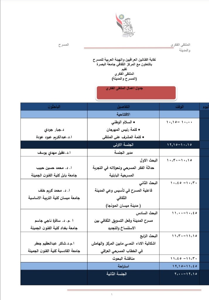 شارك الاستاذ المساعد الدكتور شاكر عبد العظيم جعفر التدريسي في كلية الفنون الجميلة جامعة القادسية في مهرجان العراق الوطني للمسرح الذي تقيمه نقابة الفنانين العراقيين بالتعاون مع الهيئة العربية للمسرح وبرعاية فخامة رئيس جمهورية العراق الدكتور برهم صالح المحترم ببحثه الموسوم ( إشكالية الأداء النصي ما بين المركز والهامش في الخطاب المسرحي العراقي ) بالتعاون مع المركز الثقافي جامعة البصرة في الملتقى الفكري الموسوم ( المسرح والمدينة ) والذي من المزمع إقامته ضمن فعاليات المهرجان والذي يبدأ من 1/8/2021 ولغاية 7/8/2021 .