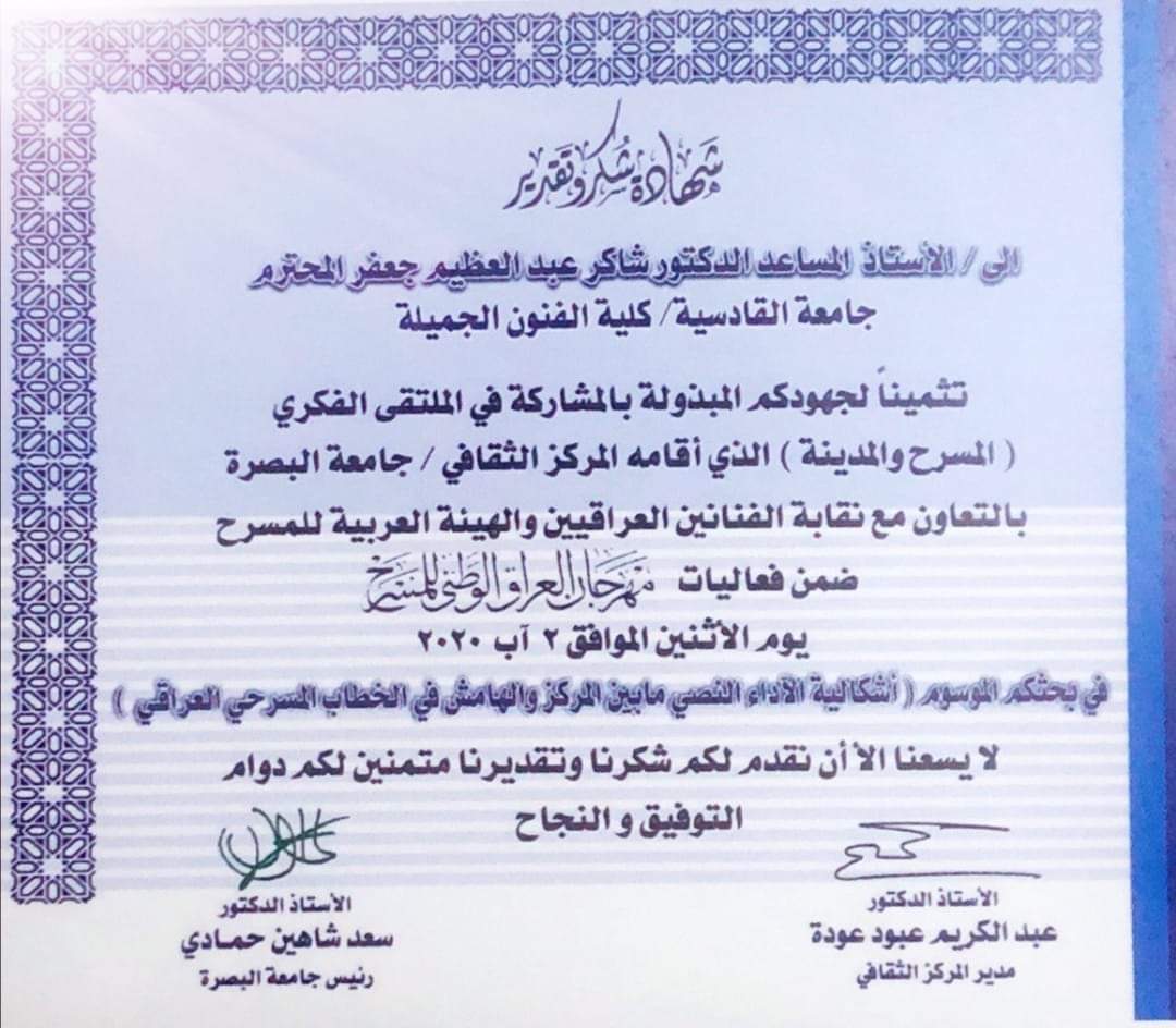 حصل التدريسي في كلية الفنون الجميلة جامعة القادسية الاستاذ المساعد الدكتور شاكر عبد العظيم جعفر كتاب شكر وتقدير من جامعة البصرة لمشاركته في الملتقى الفكري ( المسرح والمدينة) الذي أقامه المركز الثقافي في جامعة البصرة ضمن أعمال مهرجان العراق الوطني للمسرح والذي تقيمه نقابة الفنانين العراقيين بالتعاون مع الهيئة العربية للمسرح والذي سيعقد برعاية فخامة رئيس جمهورية العراق الدكتور برهم صالح المحترم .