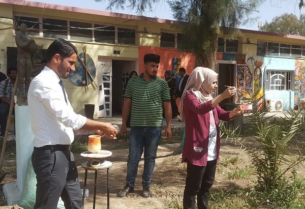 برعاية السيد عميد كلية الفنون الجميلة الاستاذ الدكتور( كاظم نوير كاظم الزبيدي ) المحترم نضم قسم التربية الفنية ورشة عمل بعنوان (الية التقنية لخزف الراكو) لطلبة المرحلة الثالثة وبحضور السيد ممثل عميد كلية الفنون الجميلة معاون العميد للشؤون الادارية الدكتور علاء عبد الكاظم المحترم وكان محاضرا في هذه الورشة كل من الست جمانة محمد النيار مدرس مادة الخزف والدكتور علي صلاح فلاح . في بداية المحاضرة تم تعريف الطلبة والحضور بمصطلح (الراكو) او (تقنية النار والدخان) ومرجعاته التاريخية، حيث كان اول ظهور لكتابة المصطلح بهيئة صورة نفذت على ختم ذهبي منح من الحاكم الياباني(هايد يوشي) الى الخزاف (كوجيرو) بعد انجازه القرميد المنفذ لمقصورة (هايد يوشي) المسماة(جو – راكو- شي) وايضا تم تعريف الحاضرين على انواع الافران وطرق تطبيق الزجاج وكيفية التزجيج والاختزال بكافة انواعه نشارة الخشب والكحول وعملية اخراج المنتج وتنظيفه من الكاربون حيث كانت ورشة عمل تطبيقية وعملية امام انار الحاضرين في فضاءات الكلية نالت استحسان الجميع خصوصا بعد نضوج القطع الخزفية وقد تقدم السيد عميد الكلية بالشكر الجزيل للست جمانه محمد النيار والدكتور علي صلاح فلاح لأقامتهم هذه الورشة القيمة بعد اطلاعه على الخزفيات والمزججات المنتجة جراء هذا الورشة .