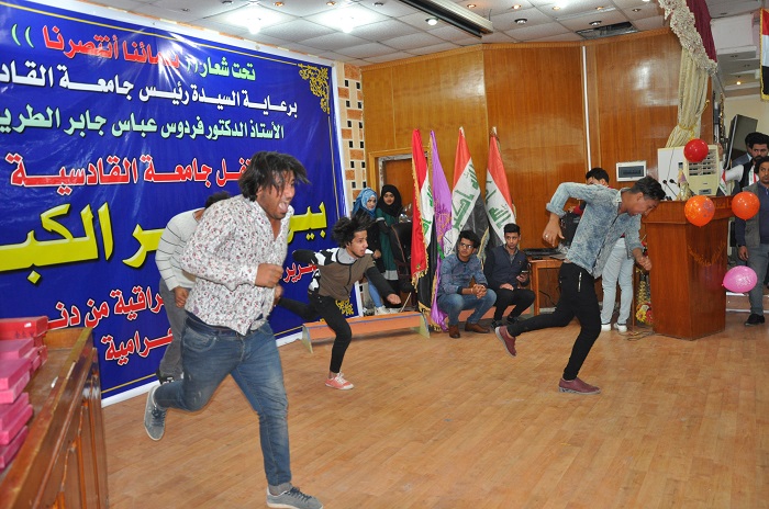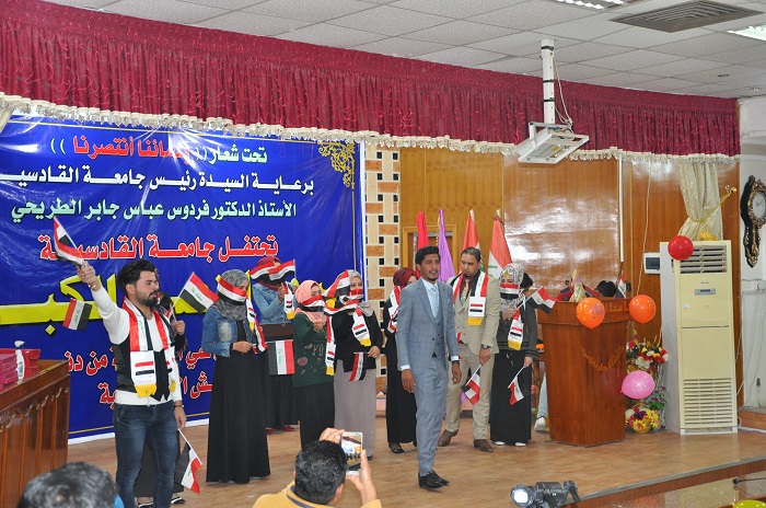 شاركت كلية الفنون الجميلة وبرعاية عميدها الاستاذ الدكتور (كاظم نوير كاظم الزبيدي) المحترم في الاحتفال المركزي لكليات جامعة القادسية في قاعة ابن خلدون كلية الادارة والاقتصاد وبحضور السيد رئيس الجامعة والسادة عمداء الكليات وضيوفا كل من السيد محافظ الديوانية الدكتور سامي الحسناوي المحترم وعدد كبير من مدراء الدوائر الحكومية والشخصيات. وتضمنت مشاركات كليتنا بإقامة معرضا شخصيا للوحات الفنية للدكتور ( عبد الحمزة عبد الامير الكلابي) افتتح المعرض السيد رئيس الجامعة والسيد محافظ الديوانية كما قدم الطالب(حيدر احمد جاسم ) وطلبة المرحلة الرابعة قسم الفنون المسرحية أنشودة وطنية بعنوان حنين وطن . وأيضا تم تقديم عرض مسرحي رائع بعنوان (next ) اخراج الدكتور حليم هاتف جاسم وتمثيل طلبة قسم الفنون المسرحية يوضح الحقب الزمنية المظلمة التي مرت على بلادنا. كما عرض فلم وثائقي من سيناريو شعبة اعلام كلية الفنون الجميلة بالتعاون مع قسم الاعلام في رئاسة الجامعة يجسد بطولات جيشنا الباسل والحشد الشعبي والإحداث والجرائم التي قام بها داعش.